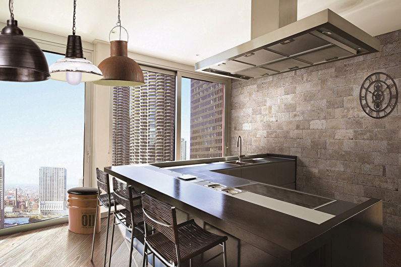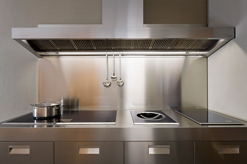 Pour concevoir une cuisine dans le style du minimalisme, de la haute technologie ou du grenier, l’acier est idéal. Un tel tablier fait référence à des options exclusives. Cela rend la pièce élégante, chère et même un peu officielle. Par conséquent, pour lui donner de la "chaleur" et une atmosphère chaleureuse, l’acier est combiné au bois.