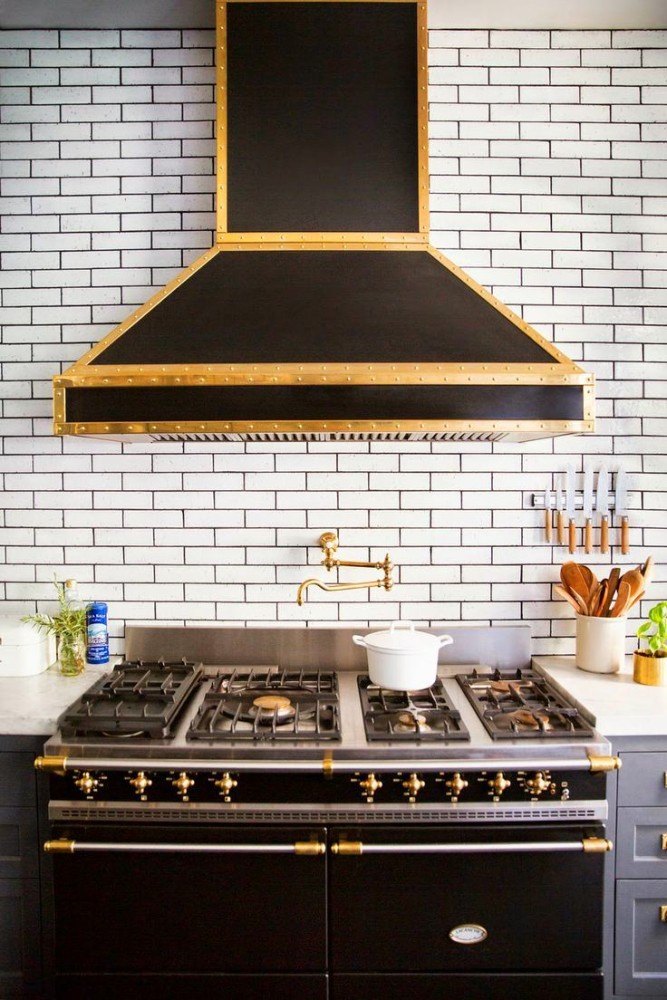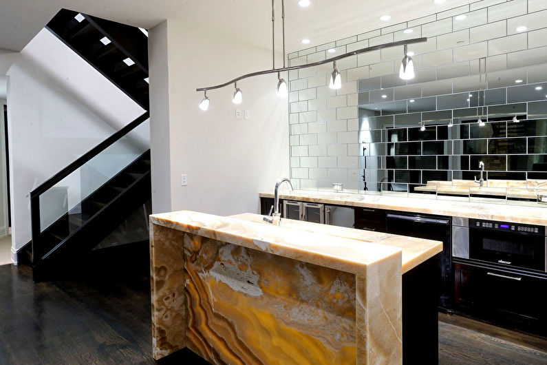 Les tabliers en acier inoxydable sont les plus populaires et les plus abordables. Il existe également des options de cuivre, mais elles coûtent beaucoup plus cher. Leur texture peut être mate, brillante ou miroir. Dans ce cas, la totalité de la surface libre de la zone de travail est recouverte d'une tôle, ce qui permet d'obtenir l'effet de monolithicité sans formation de joints. Un éclairage spécial vous permet de mettre efficacement en valeur le tablier.