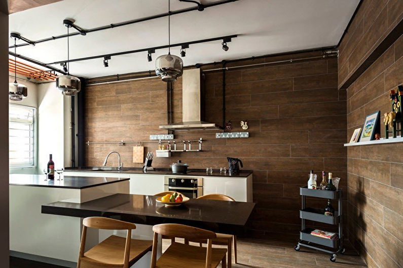 La tuile convient à la conception de la totalité du mur et va bien avec d'autres matériaux. Travailler avec ce type de matériel requiert certaines compétences, et le travail de face est un processus assez facilement souillé. Vous devez également tenir compte du fait que la mise à jour du design d'une cuisine avec des carreaux ne fonctionne souvent pas. Par conséquent, son choix doit être abordé de manière responsable.