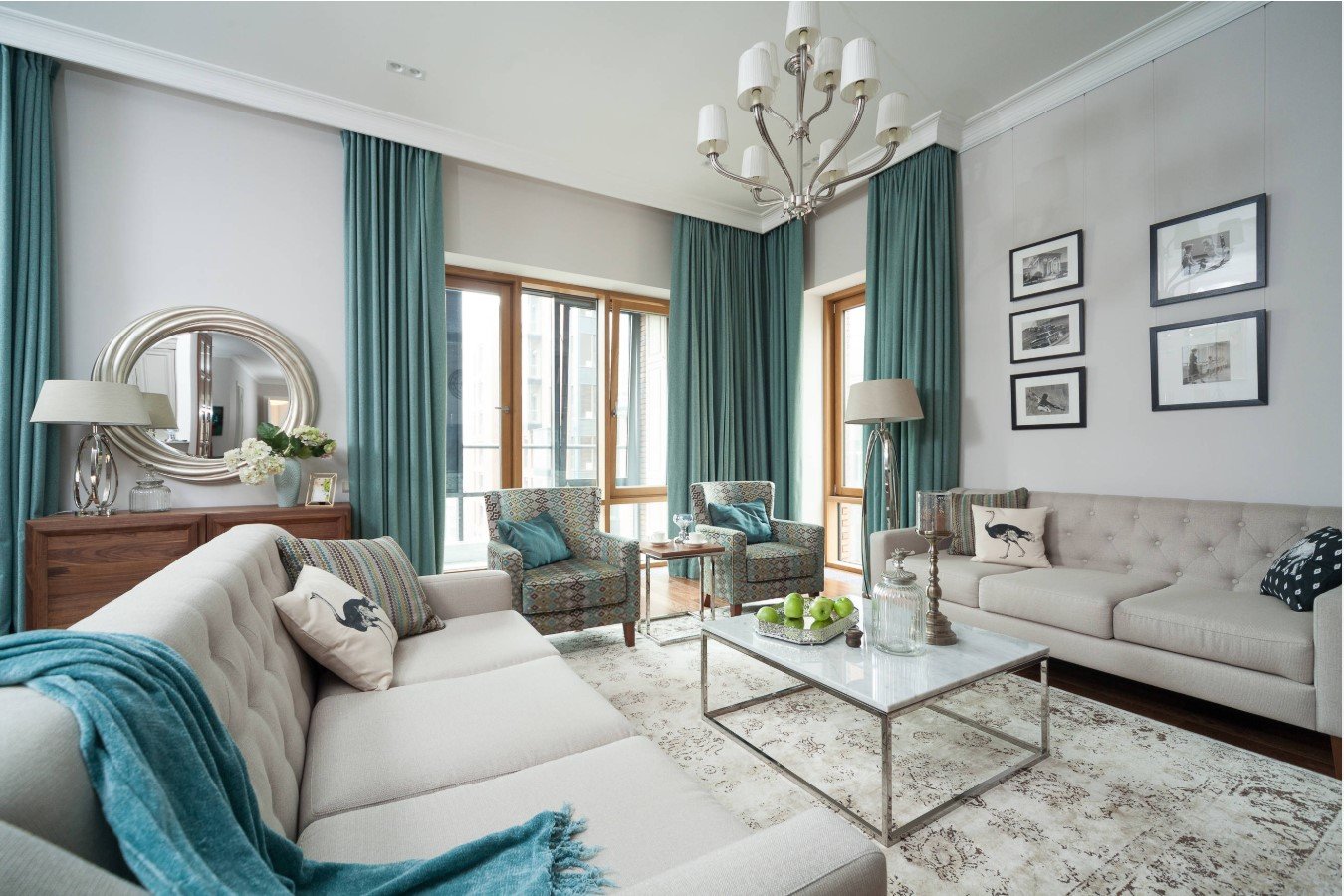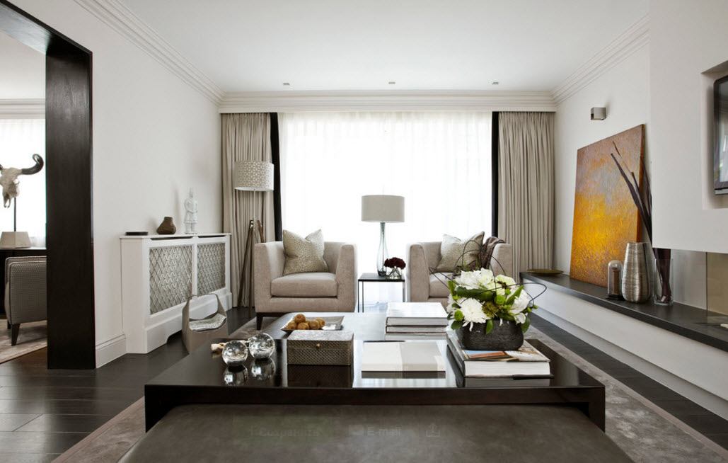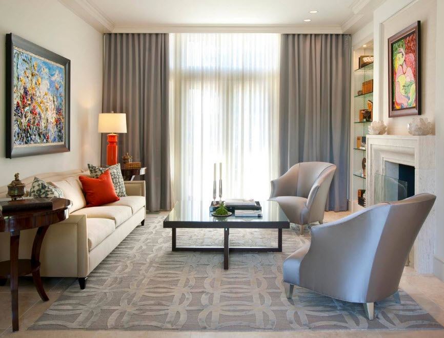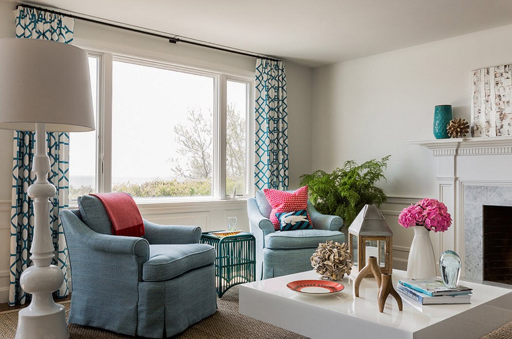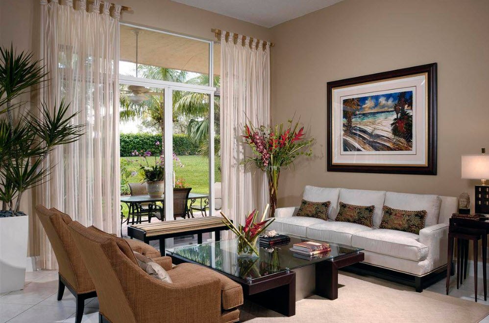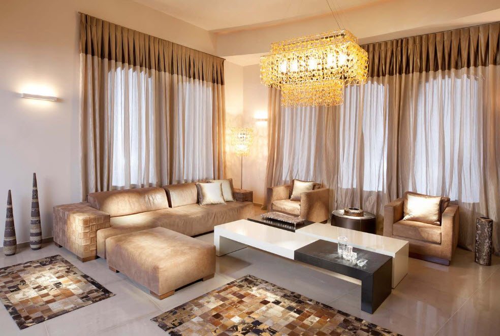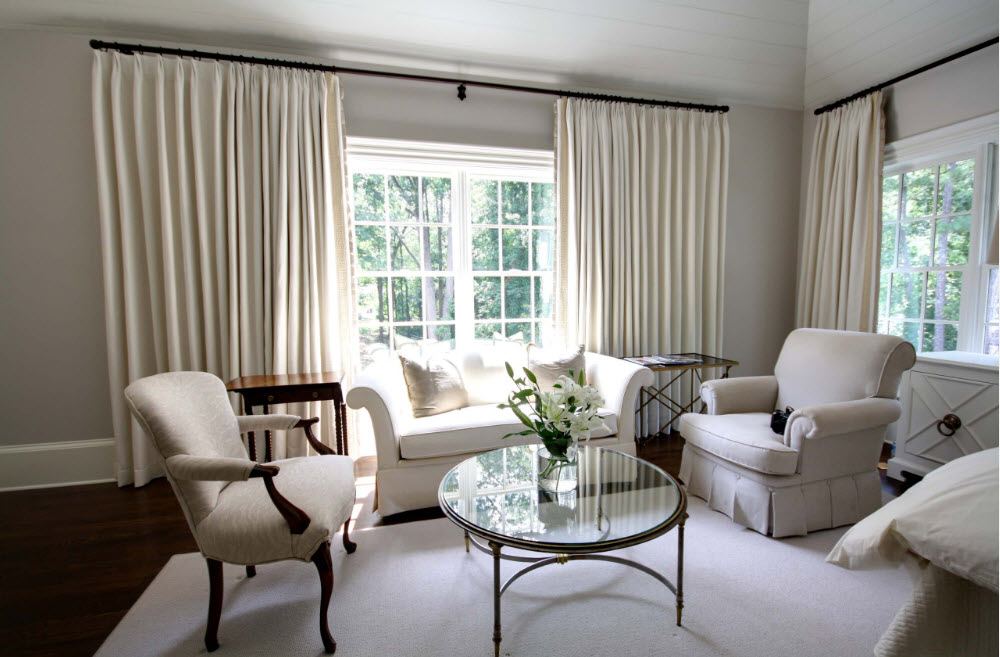 Si la décoration du plafond, des murs, du rembourrage des meubles est réalisée dans une plage de lumière monochromatique, c’est alors sur la fenêtre que l’accent doit être mis. Le motif volumétrique sur les rideaux plus sombres attirera sûrement l'œil.