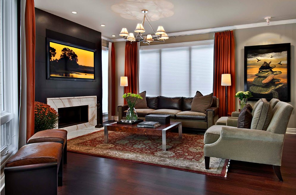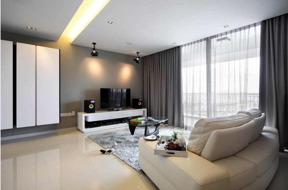 Gardez à l'esprit l'emplacement du téléviseur. S'il est installé en face de la fenêtre, la lumière qui tombe ne devrait pas laisser de reflets. Par conséquent, une attention particulière doit être portée à la densité du tissu de rideau sélectionné.Il en va de même pour les salles situées au rez-de-chaussée des bâtiments.