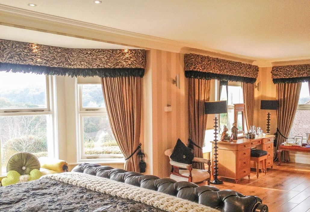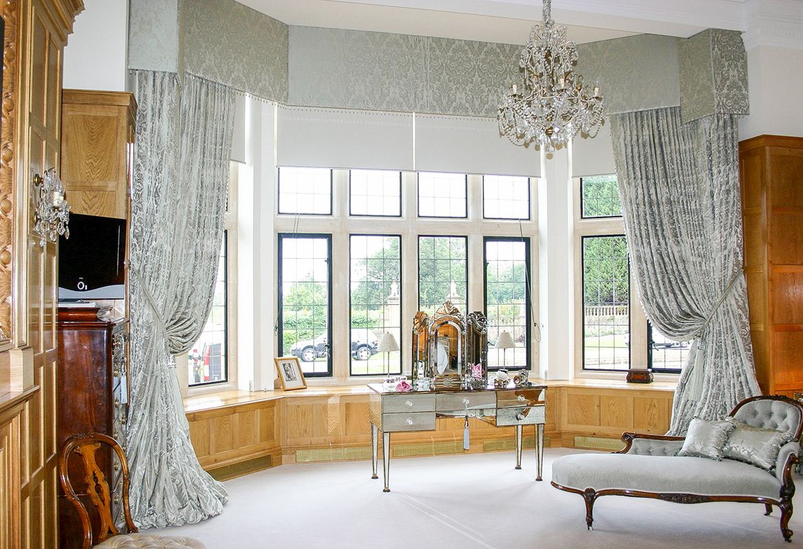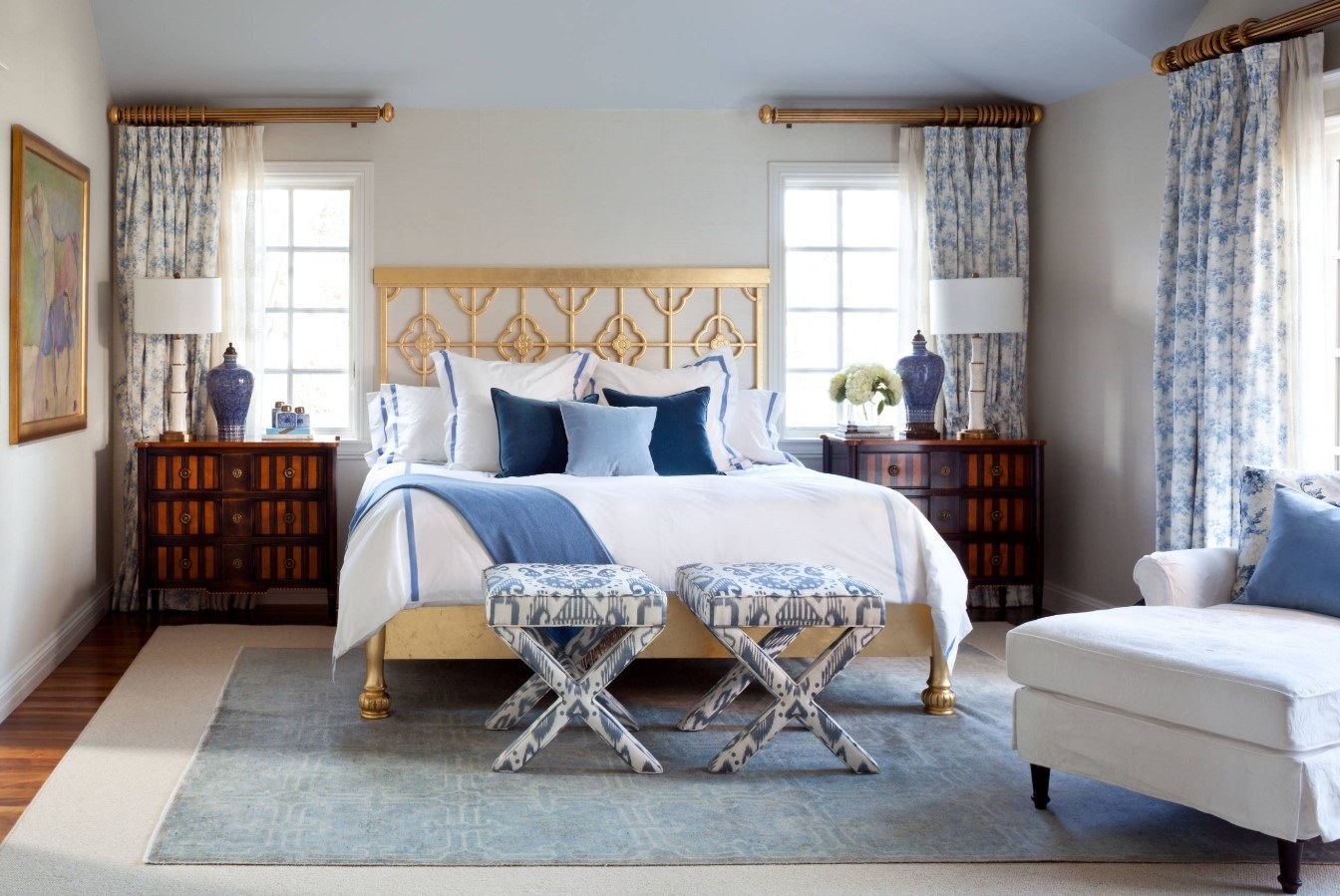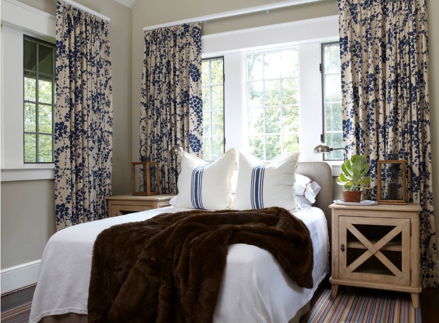 Lors de la création d’une fenêtre dans la chambre, les textiles choisis sont les mêmes que sur le lit. C'est une technique de conception populaire qui recrée une image complète et harmonieuse.