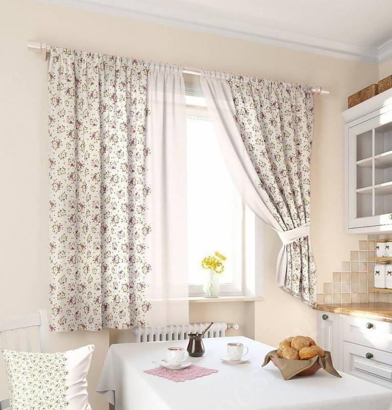 Les rideaux de petits pois ou de fleurs sont la meilleure option pour une cuisine de style campagnard. À l'aide d'aimants ou de punaises, ils sont fixés sur les côtés de la fenêtre. Il est permis de se limiter uniquement au tulle, mais il est nécessaire de choisir un motif dense.