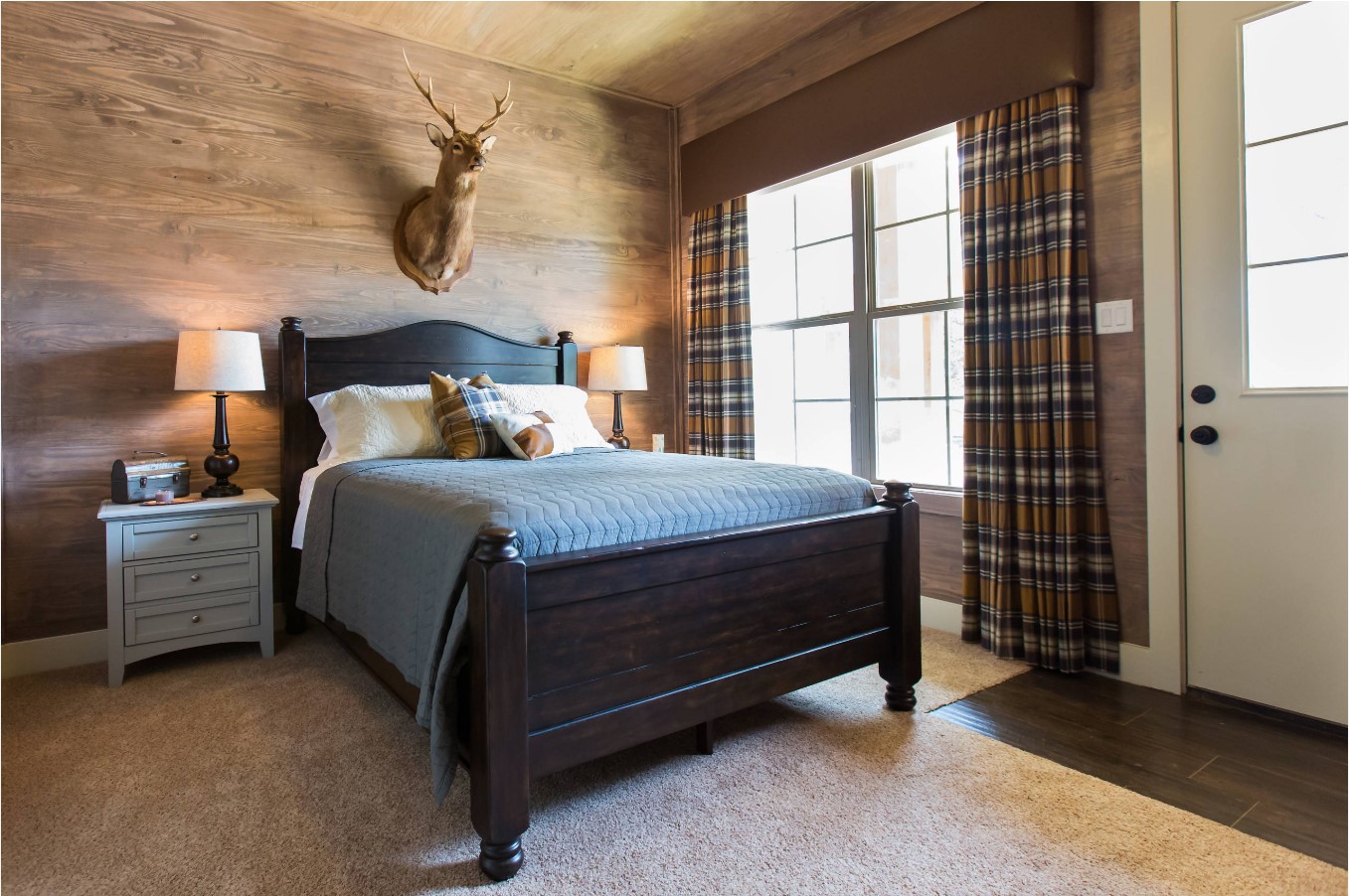 Chambre à coucher avec baie vitrée est une option difficile à mettre en œuvre. Dans cette zone, des feuilles de protection ou des stores peuvent être disposés et la pièce est décorée de rideaux aux teintes plus sombres.