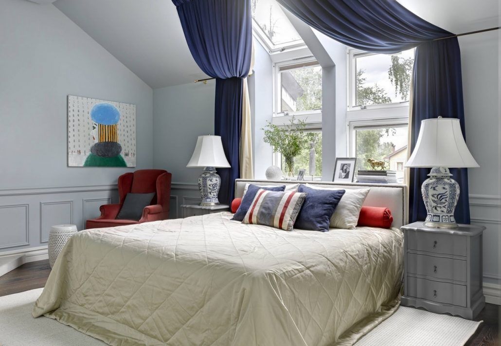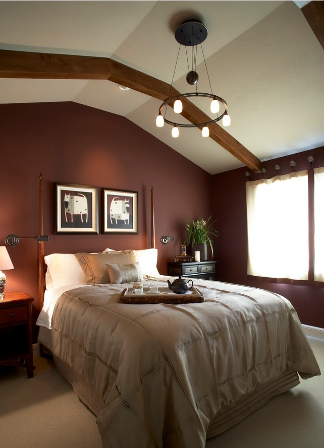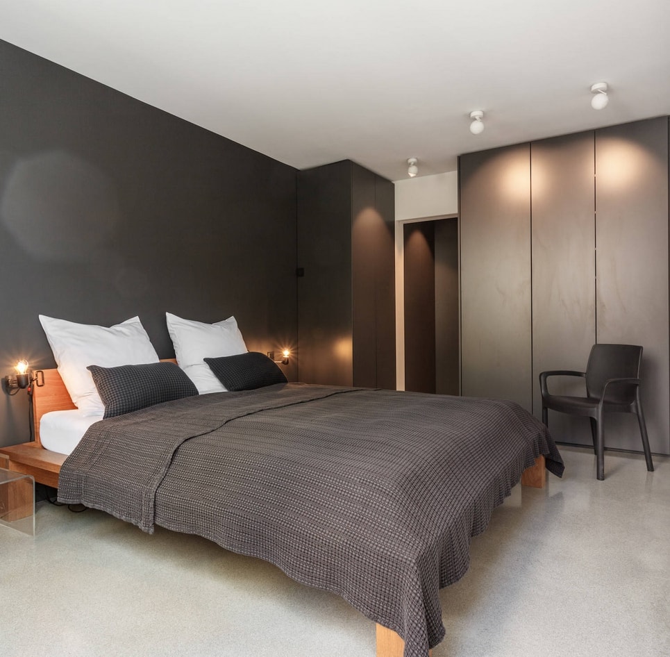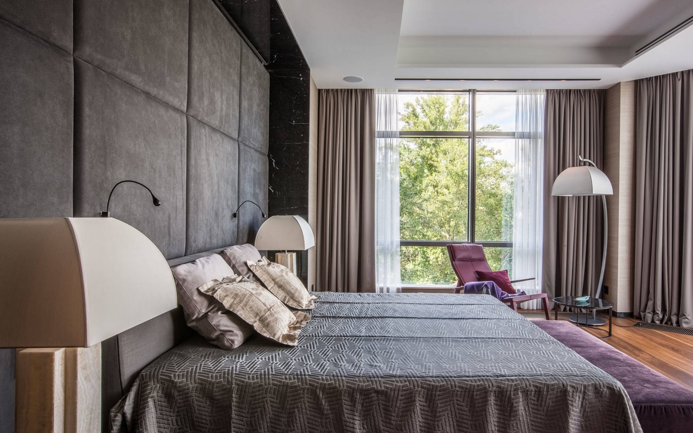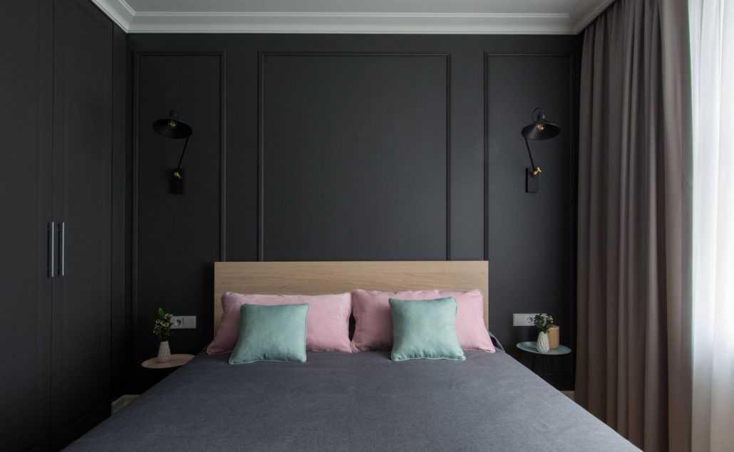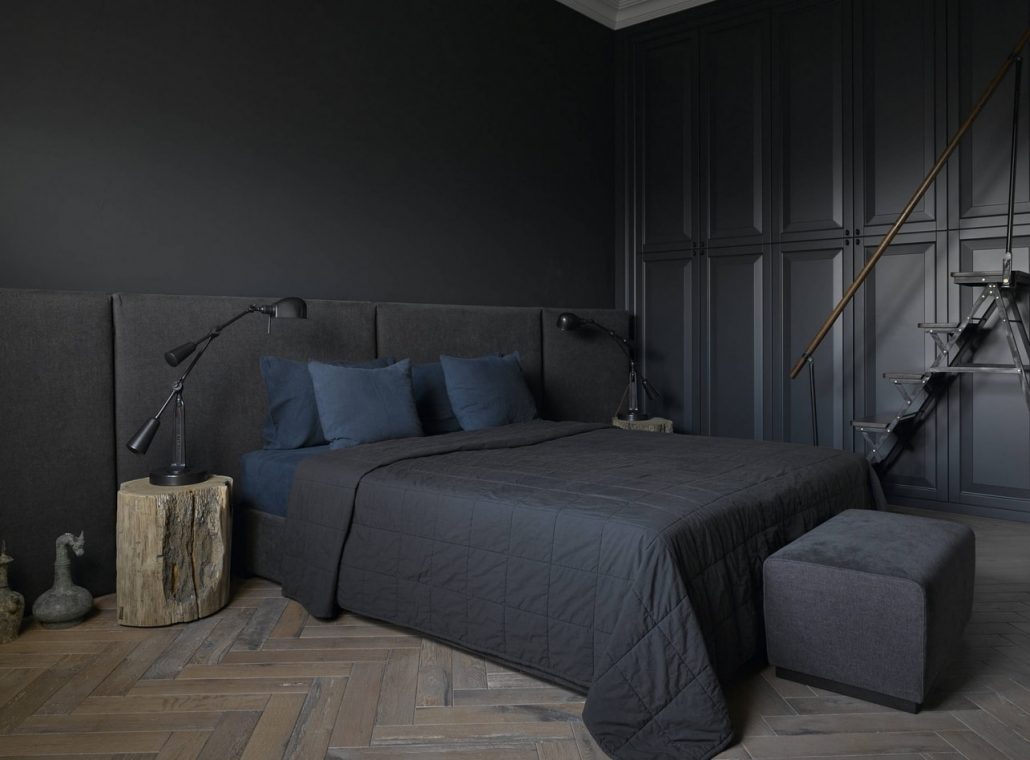 Les murs sombres créent une image audacieuse et une énergie forte dans la chambre à coucher. Les couleurs sombres conviennent aux grandes chambres et à plusieurs fenêtres.