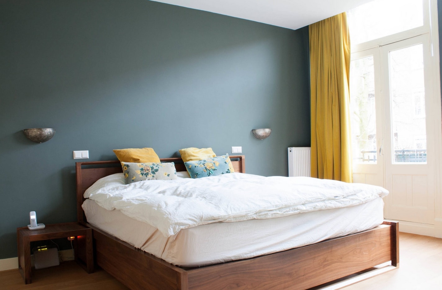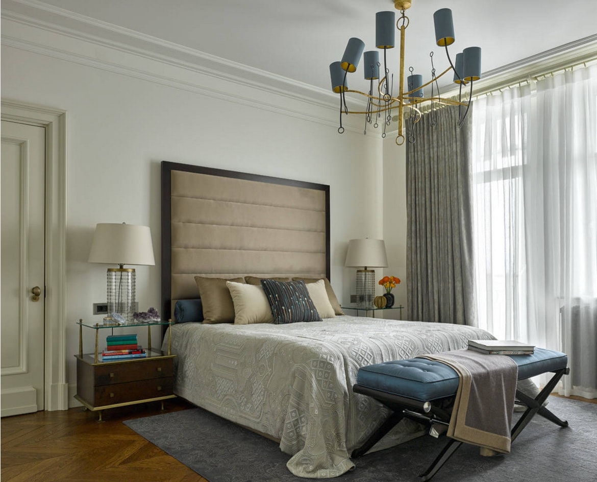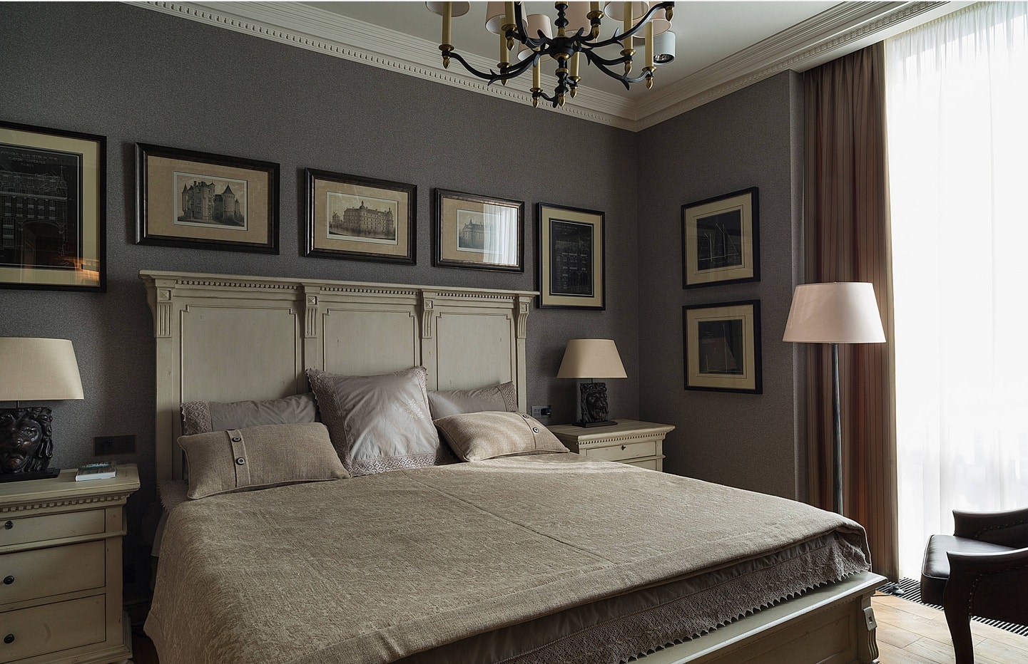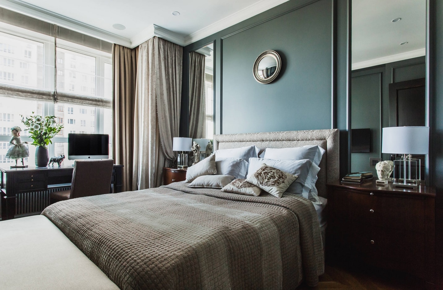 Les murs sombres créent une image audacieuse et une énergie forte dans la chambre à coucher. Les couleurs sombres conviennent aux grandes chambres et à plusieurs fenêtres.