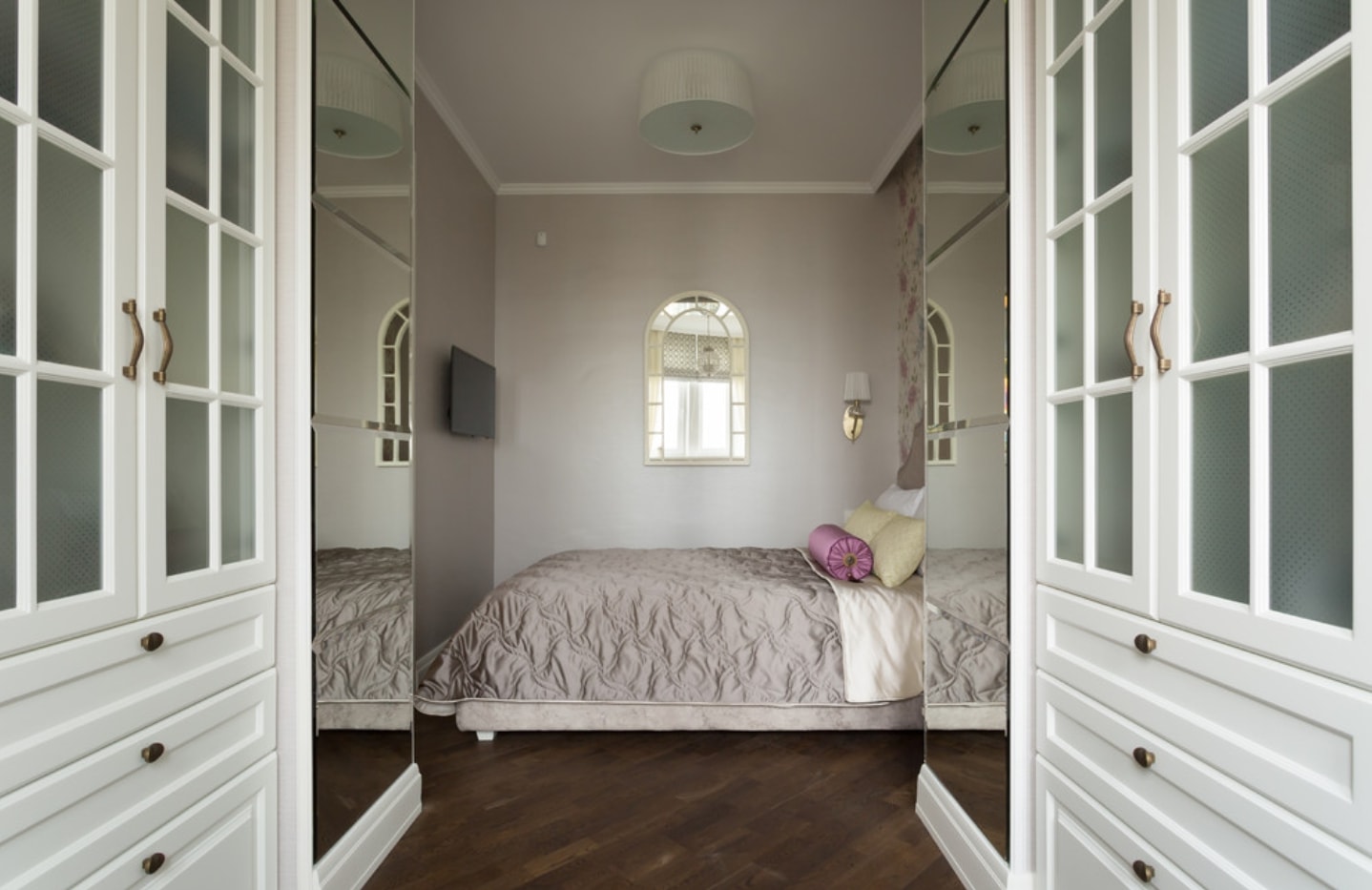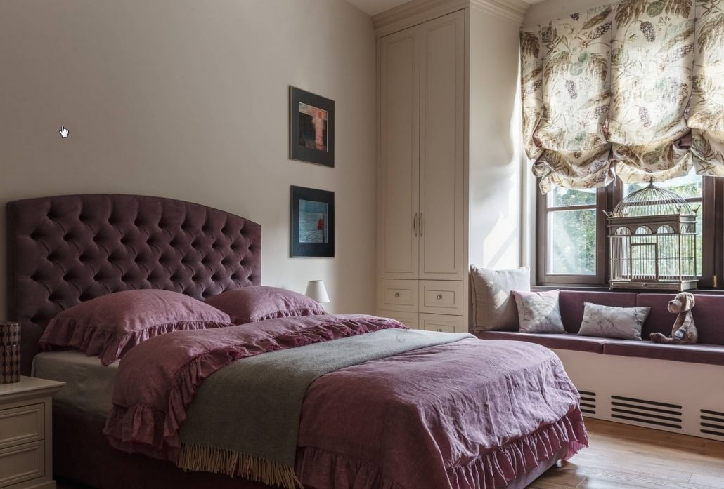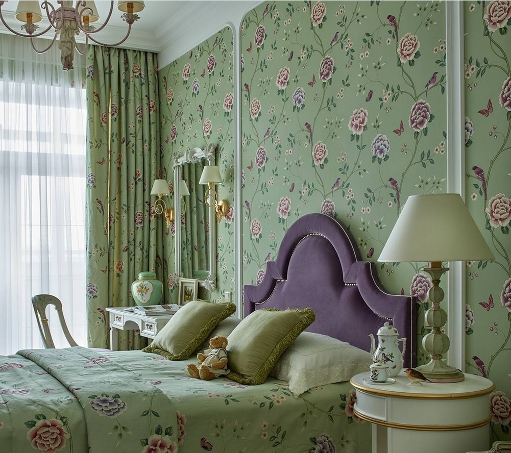 Les murs lilas conviennent aux meubles clairs. Cette couleur est idéale pour les petites chambres. Il va bien avec les fleurs laitières, beiges et roses.