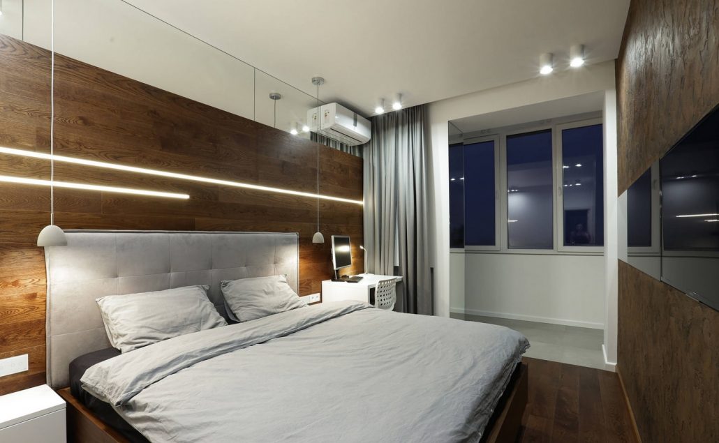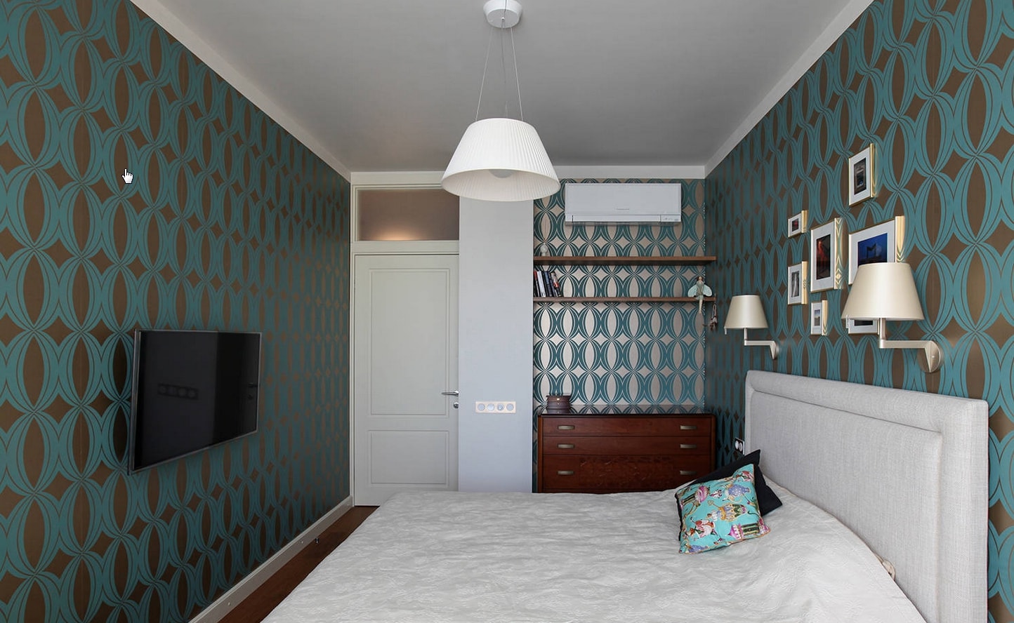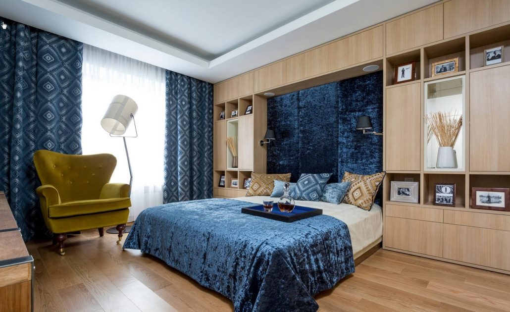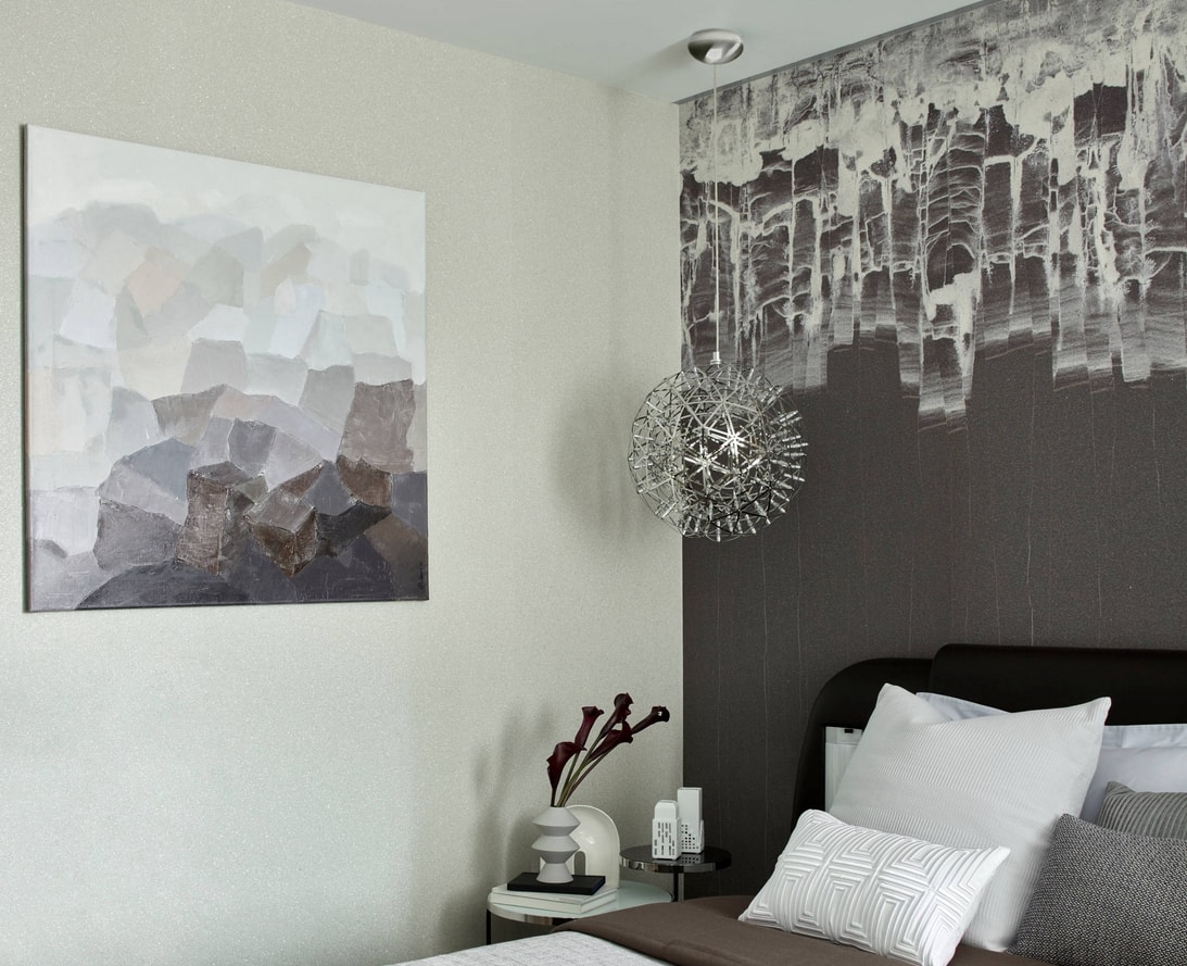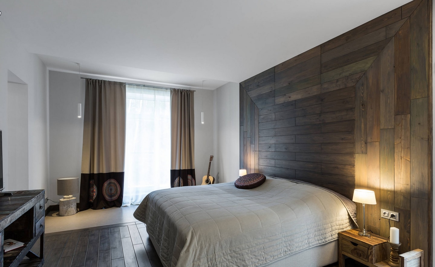 Dans la chambre à coucher, le mur au-dessus du lit peut devenir un objet de manifestation de fantasmes et de créativité. Il est décoré avec des panneaux photo, des cadres, des peintures, des textiles, du bois. Mur d'accent apportera une couleur, une forme et une texture individuelles au design général de la chambre à coucher.