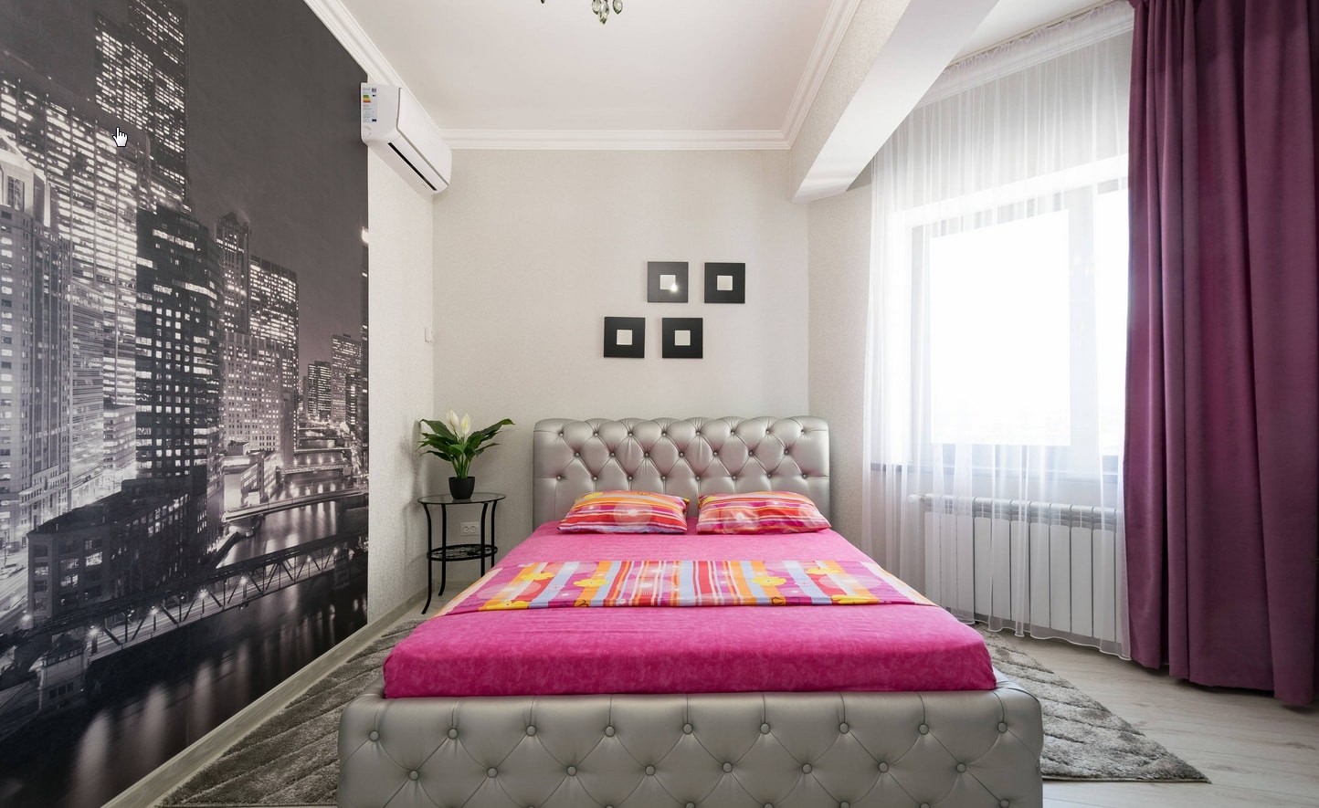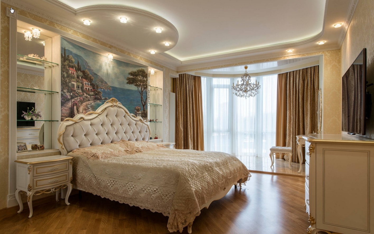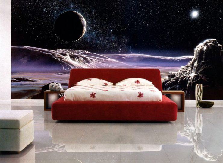Les peintures murales gagnantes sont plus visibles sur les murs de la chambre que dans les autres pièces. Ils vont agrandir visuellement une petite pièce. Sur le mur, ils peuvent être appliqués en plusieurs parties ou en tant que toile entière.