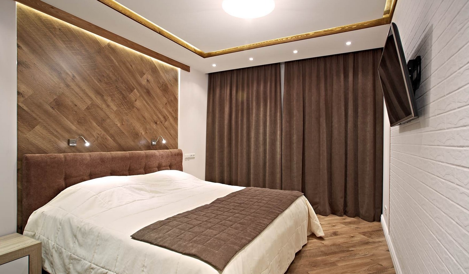 Récemment, un stratifié est souvent utilisé sur les murs d'une chambre à coucher. La texture de l'arbre rend la pièce plus attrayante. Un tel matériau est facile à installer et offre une plus grande durabilité par rapport aux autres revêtements.