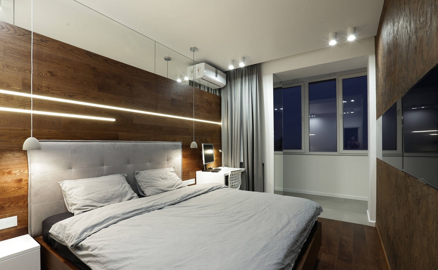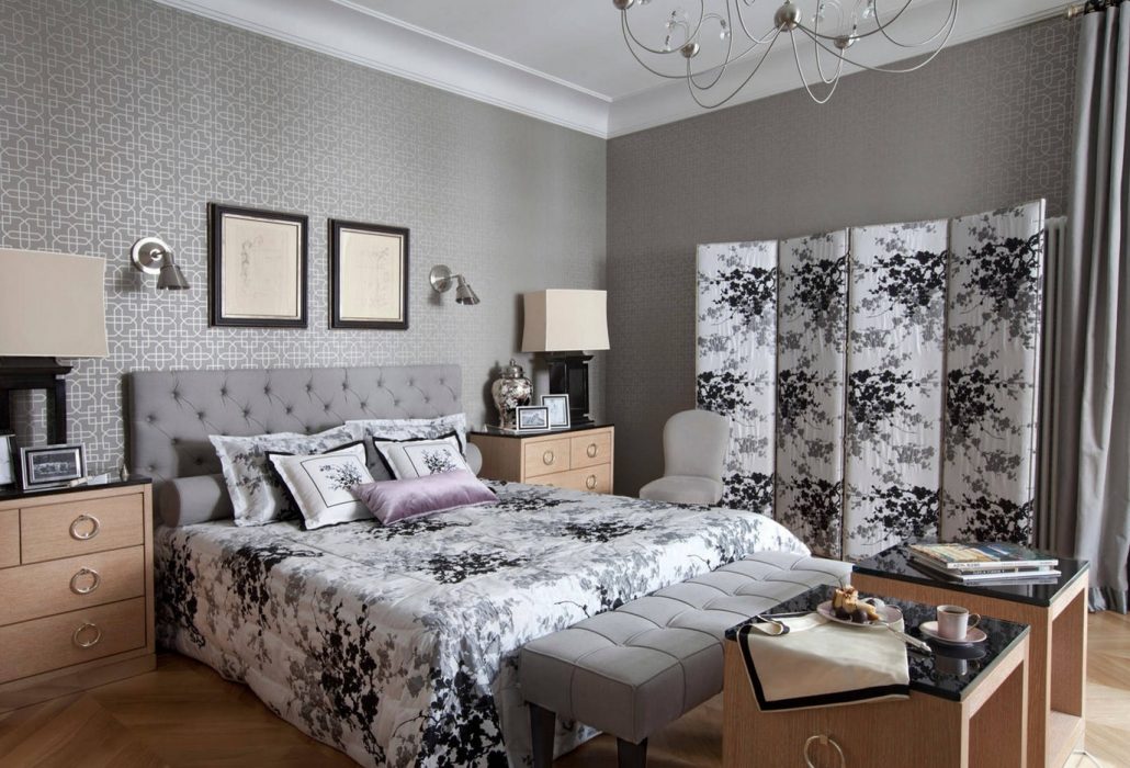 Les murs gris peuvent être combinés avec des meubles blancs et des motifs gris sur le tapis de la chambre. Mais cette nuance n'a pas besoin de surcharger la chambre à coucher.