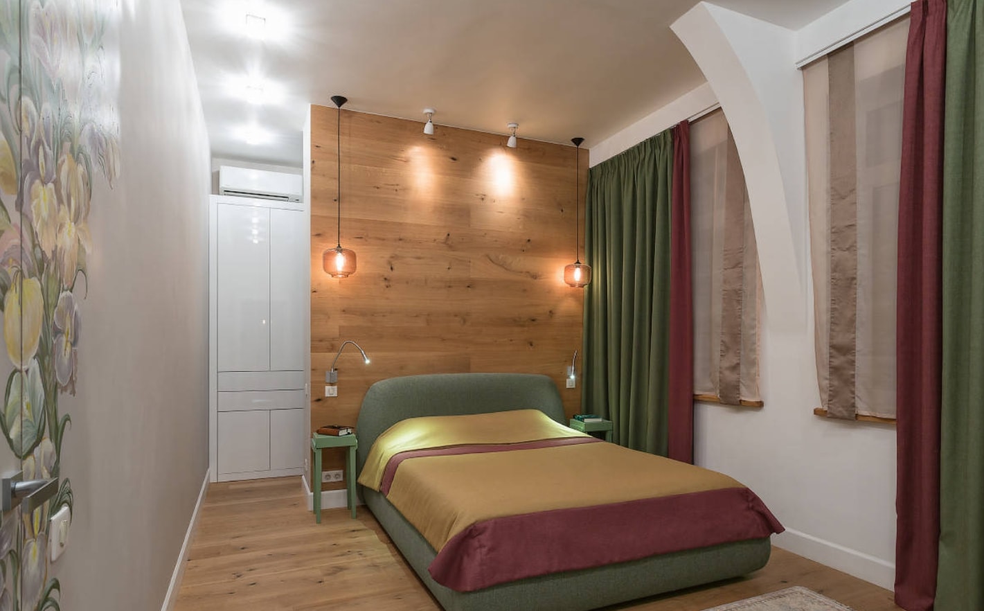 Jusqu'à cinq couleurs différentes peuvent être combinées dans la même pièce. L'ombre de la chambre à coucher est choisie de manière à ce que les murs soient plus clairs que les meubles et que les meubles eux-mêmes soient plus sombres que le sol.