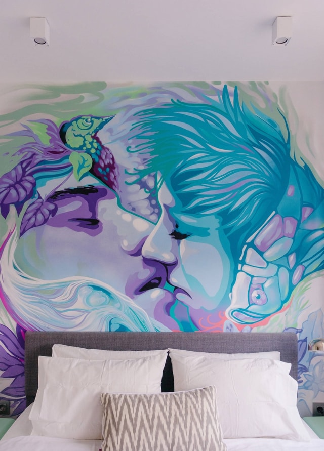 Une chambre de tout style peut être décorée avec de la peinture. On utilise de la peinture acrylique et le dessin est appliqué à l'aérographe. Cela peut être un portrait photo, un effet de dégradé, un graffiti, un motif, une peinture.