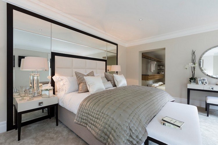 Il met en valeur le style de la pièce, la rend plus lumineuse, lève le plafond, augmente l’espace - un miroir. En choisissant un mur de miroir, vous devez vous rappeler que c'est un matériau fragile. Le miroir nécessite un nettoyage constant. Pour la chambre à coucher, une mosaïque de ce matériau fragile sera idéale. Les bords de chaque miroir sont soulignés de plastique, de lattes et de moulures.