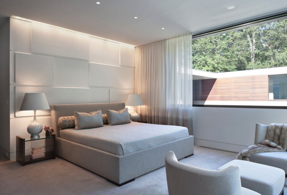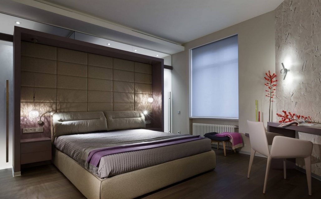À la tête du lit, vous pouvez créer une niche à partir de cloisons sèches. Ainsi, l'apparence de la pièce est mise à jour.Cette solution constructive n'a qu'une fonction esthétique. Décorez-le avec des miroirs, du plâtre, du papier peint photo, du tissu.