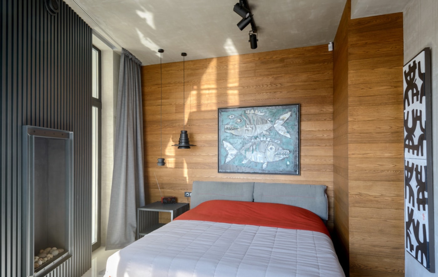 Pour un style écologique, un mur en bois au-dessus du lit convient. Il est fait de panneaux de bois, de planches. Son installation est assez simple, l'alignement des murs n'est pas nécessaire et tous les fils et les communications sont cachés en parallèle. Prendre soin de cette couverture ne sera également pas une préoccupation. C'est beau quand un tel mur est complété par des peintures ou des sculptures.