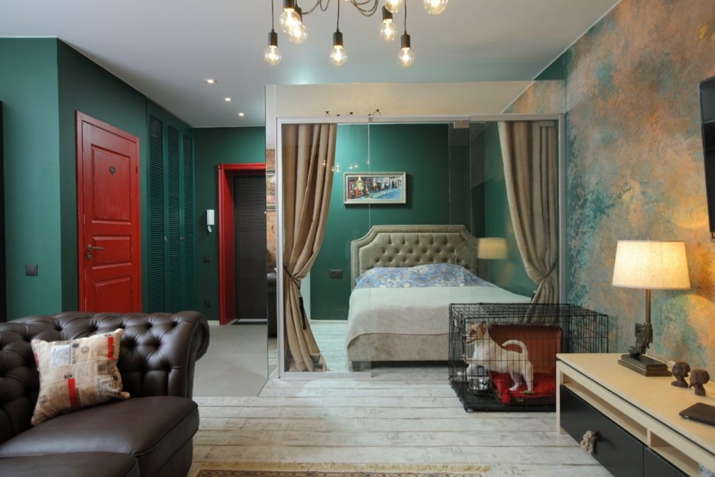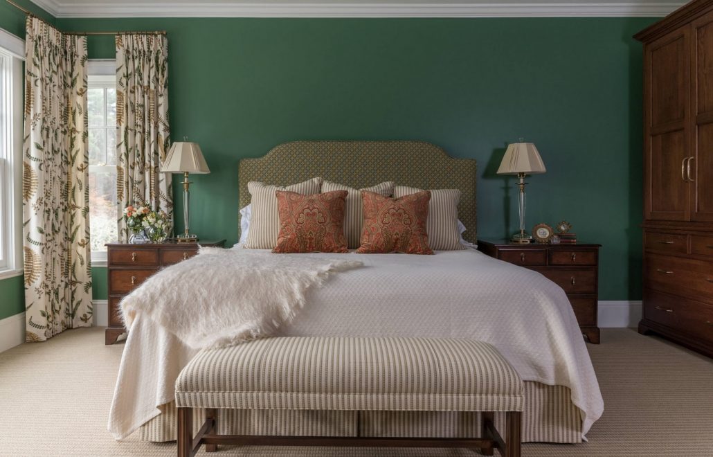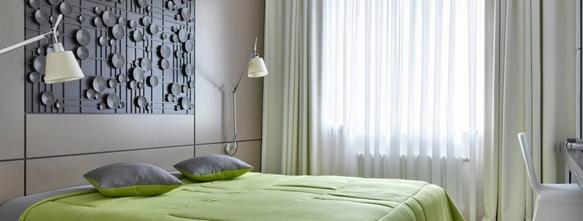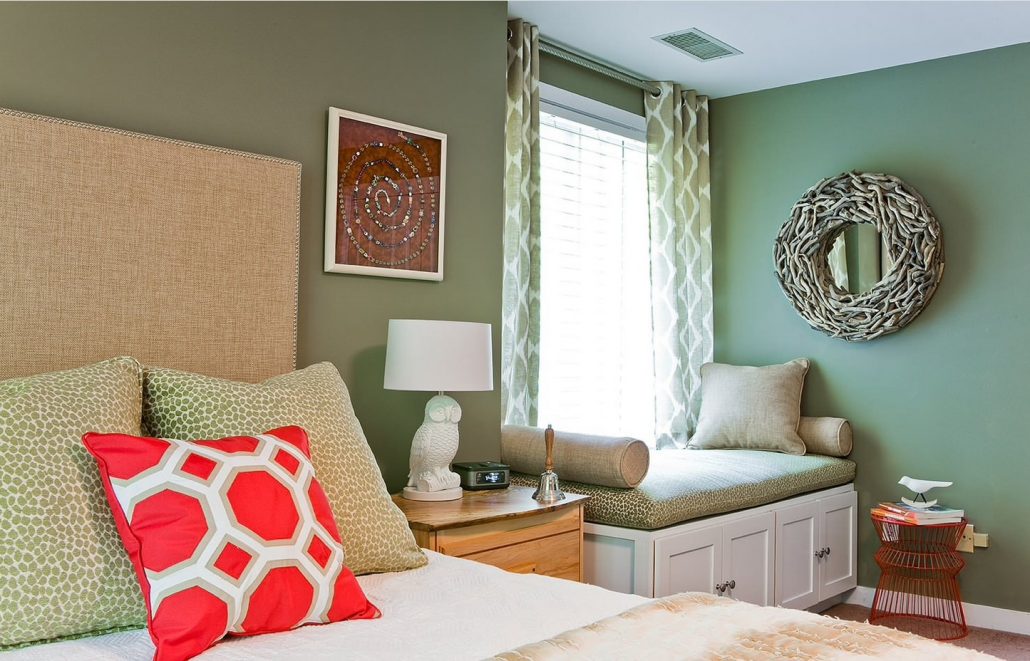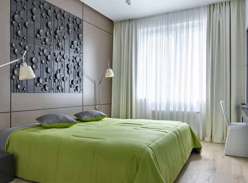 Pour les problèmes de sommeil, la chambre doit être décorée en vert. Ses nuances conviennent - olive et pistache. Le vert va bien avec les couleurs beige, marron, gris et les meubles en blanc.