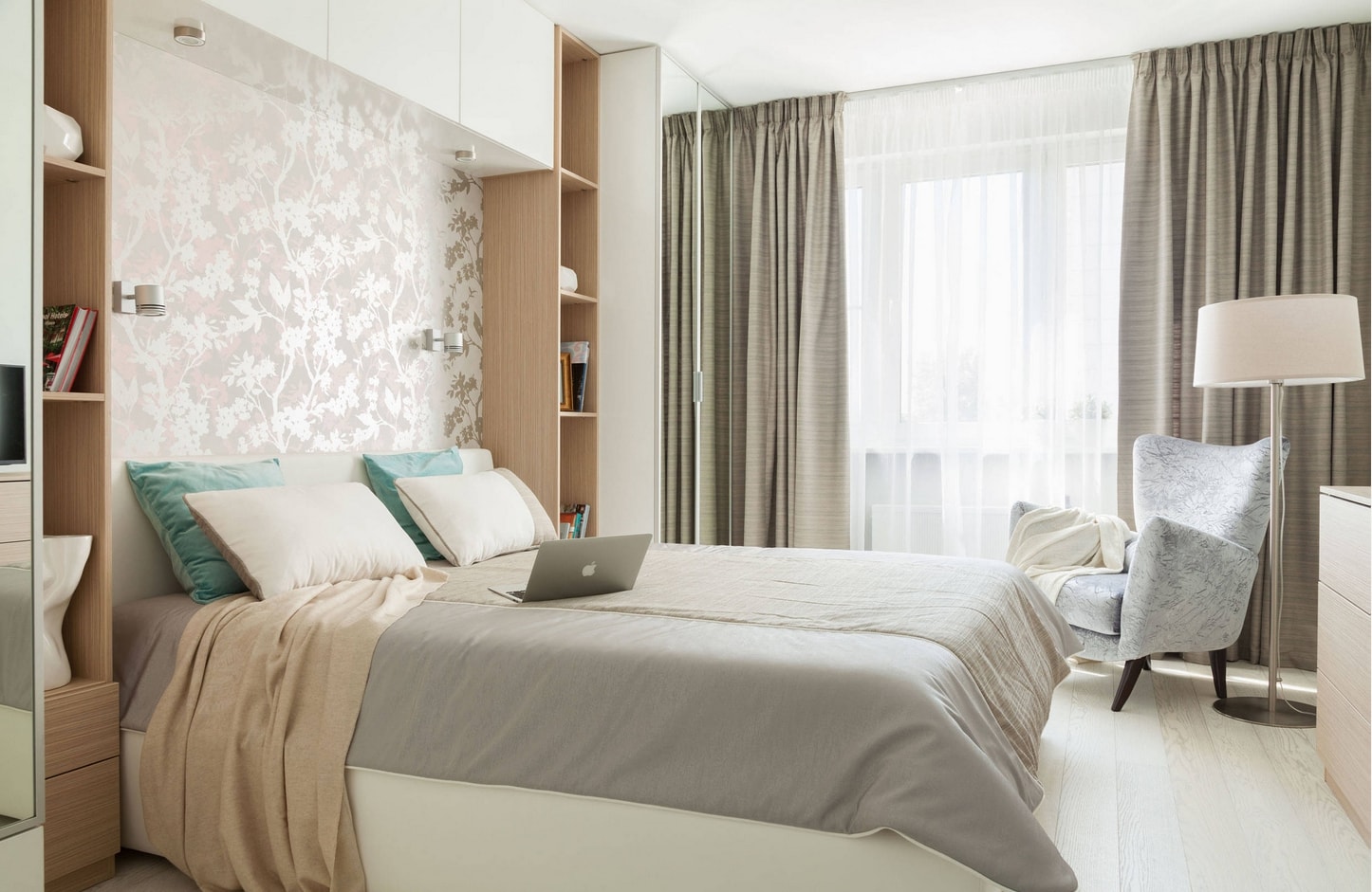 En raison de la possibilité de créer une base pour d'autres couleurs et de la polyvalence dans les chambres à coucher, les murs beiges sont très populaires. Ils peuvent être combinés avec toutes les nuances de violet, turquoise, bleu, marron et gris.