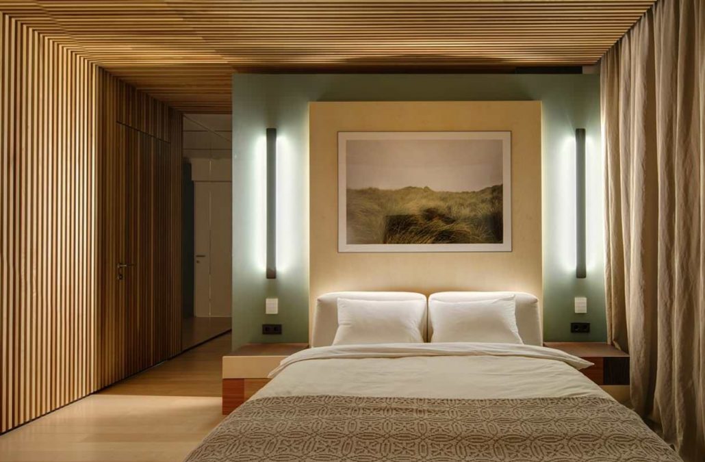 Les murs de la chambre à coucher doivent être finis avec des matériaux écologiques - plâtre, stratifié, tissu, papier peint, peinture.