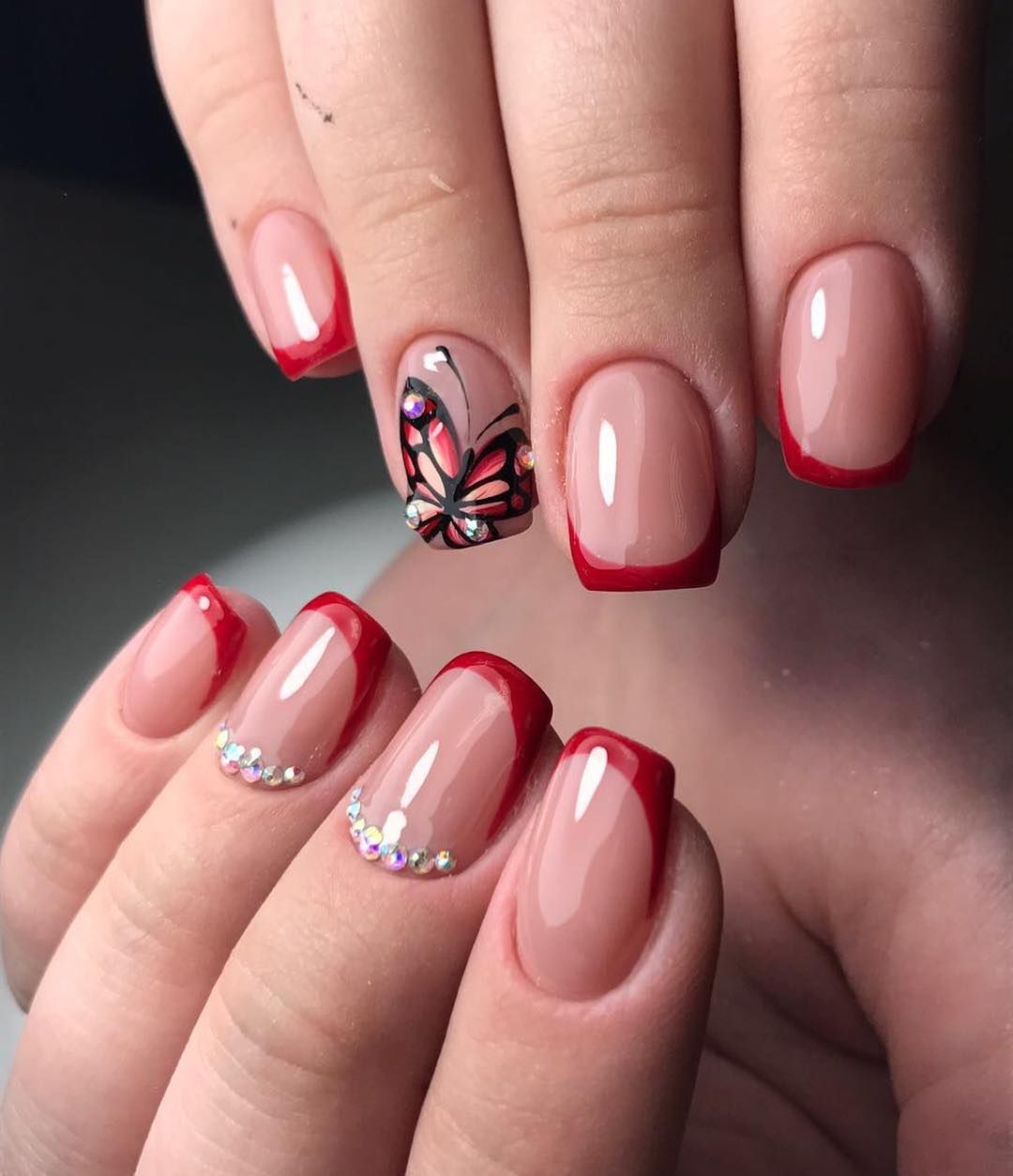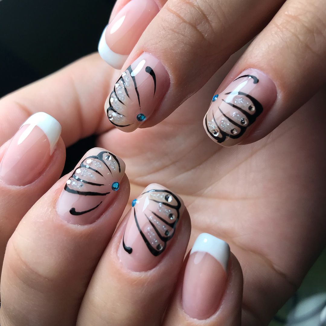 Insistez sur la légèreté et la neutralité de la manucure en utilisant l’image d’un papillon. Et de plus en plus souvent, les maîtres de clous ne dessinent que des ailes et les décorent avec une variété de types de décor.