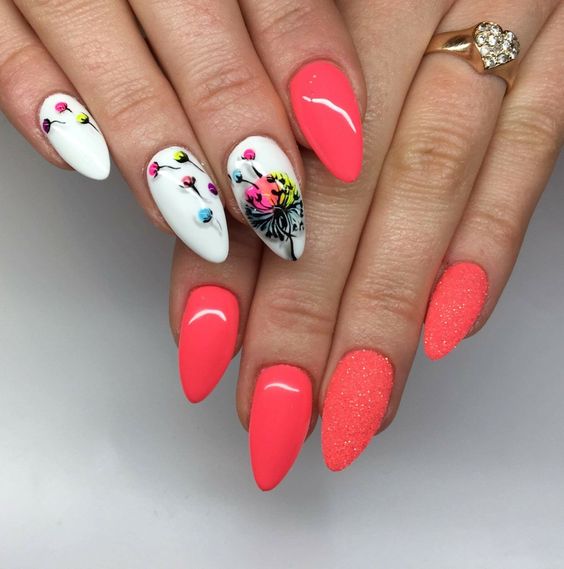 Il convient de noter une manucure sur les ongles acérés en été. Cela n'a pratiquement rien à voir avec le design pour le reste des saisons. C’est parce que c’est en été que les couleurs claires et vives prédominent dans la garde-robe, et que les filles veulent expérimenter les images et avoir l’air un peu plus féminine et tendre.