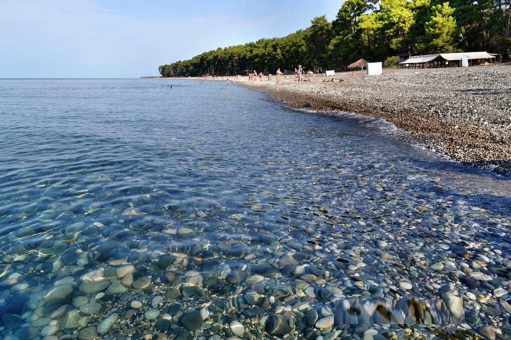 La zone côtière de Pitsunda est une longue plage. S'il n'y a pas de tempête, l'eau de la mer Noire dans la région de Pitsunda est très claire. Les plages de la ville sont gratuites et elles sont toutes en galets. La ville et la côte sont séparées par une pinède. Et sur la côte elle-même, il existe une union de pensions "Pitsunda Resort". Sur le chemin de la mer, il y a des magasins de fruits, des boutiques de souvenirs et de nombreux cafés. Du centre-ville à la plage, vous devez surmonter une distance de 800 mètres. Il y a généralement peu de monde sur les plages et si vous allez un peu plus loin sur la côte, il est alors facile de trouver des endroits où il n'y a pratiquement pas de vacanciers.