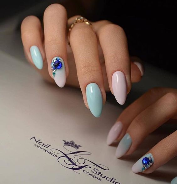 La douceur des tons pastel est encore mieux exprimée dans un dessin en dégradé. Mais cela ne signifie pas qu'il vaut la peine de mélanger plusieurs couleurs. Au contraire, deux ou trois tons seront beaucoup plus attrayants. Par exemple, la guimauve rose avec du bleu est une excellente solution si vous souhaitez réaliser la version la plus délicate et sophistiquée. En outre, le dégradé peut ne pas être utilisé sur tous les ongles, mais uniquement en mettant l'accent sur un ou deux.