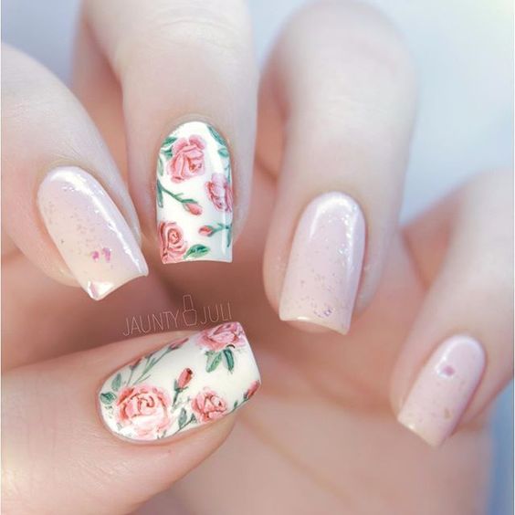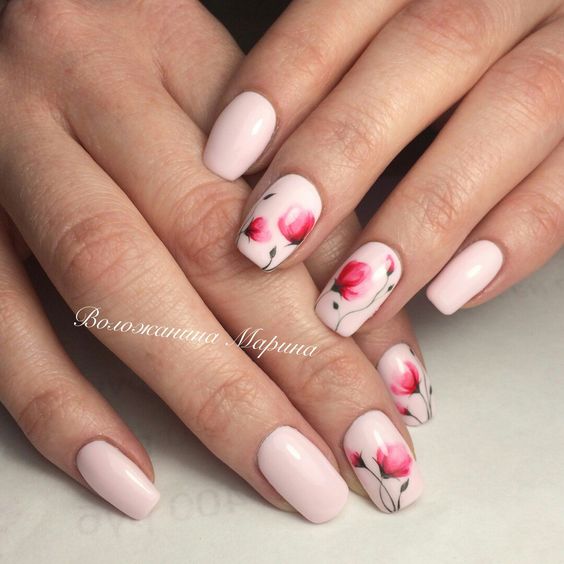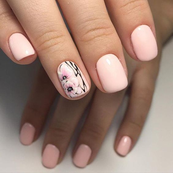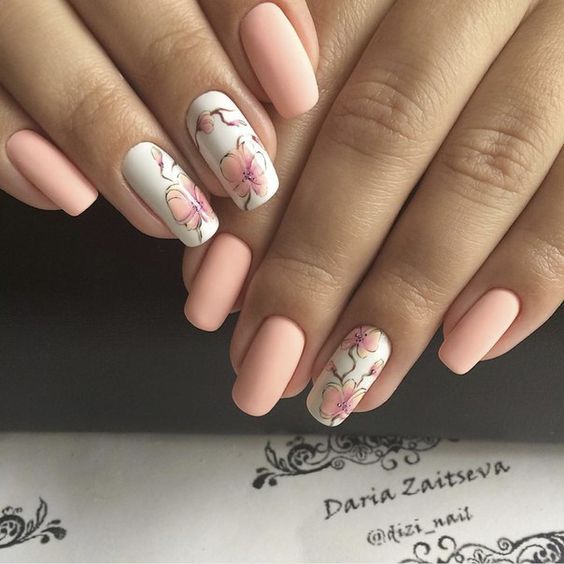 Étant donné que cette palette de couleurs est très délicate, un motif floral aura fière allure. Il ajoutera une touche de romance à l'image et mettra l'accent sur la féminité. En ce qui concerne l'impression elle-même, il n'est pas nécessaire de la reproduire dans la même teinte. Les options de contraste ne sont pas moins élégantes. En outre, pour cette raison, vous pouvez mettre l’accent sur la manucure.
