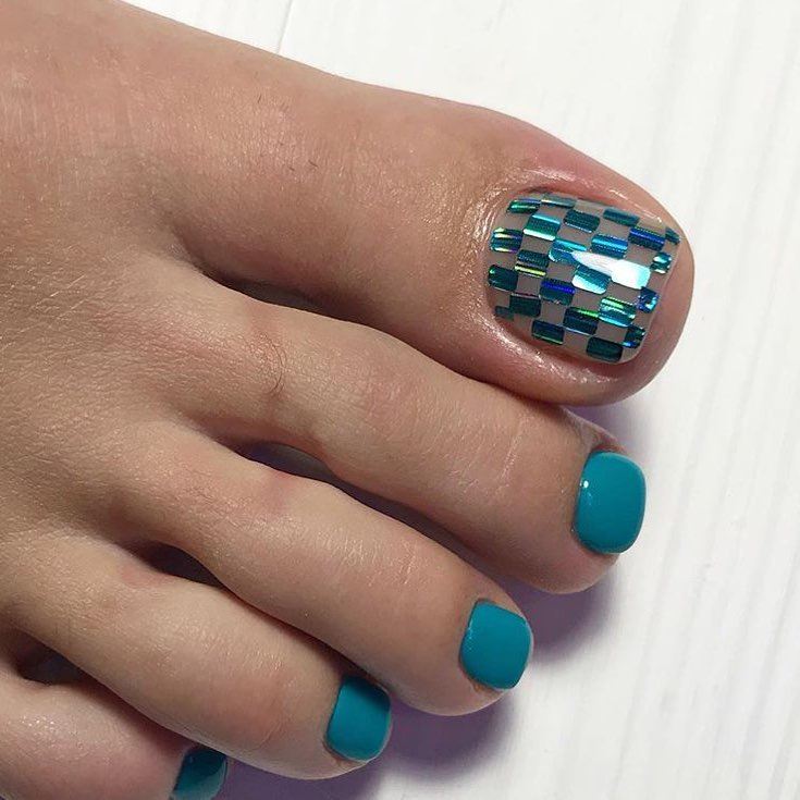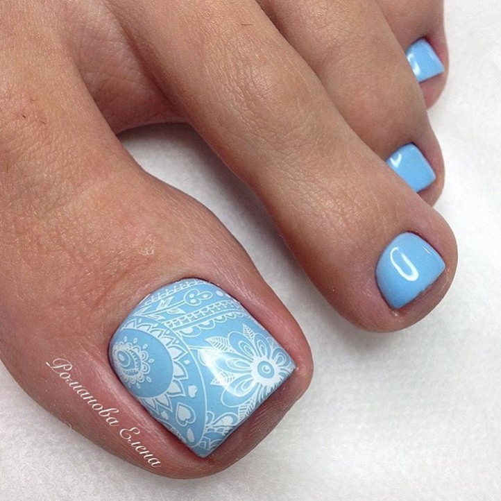 Une autre nouveauté dans la conception estivale de la pédicure est la toile d'araignée. Auparavant, la technique de la ligne d'araignée était utilisée pour créer une belle et intéressante manucure. Aujourd'hui, cette technique est utilisée avec succès pour créer une pédicure tendance. Des motifs inhabituels et attrayants dans le style des toiles d'araignées, réalisés sur un pouce en noir, blanc ou or, vous pouvez diversifier en ajoutant du papier d'aluminium, du kamifubuki ou des strass. Une telle pédicure est incroyablement belle et attrayante en été.