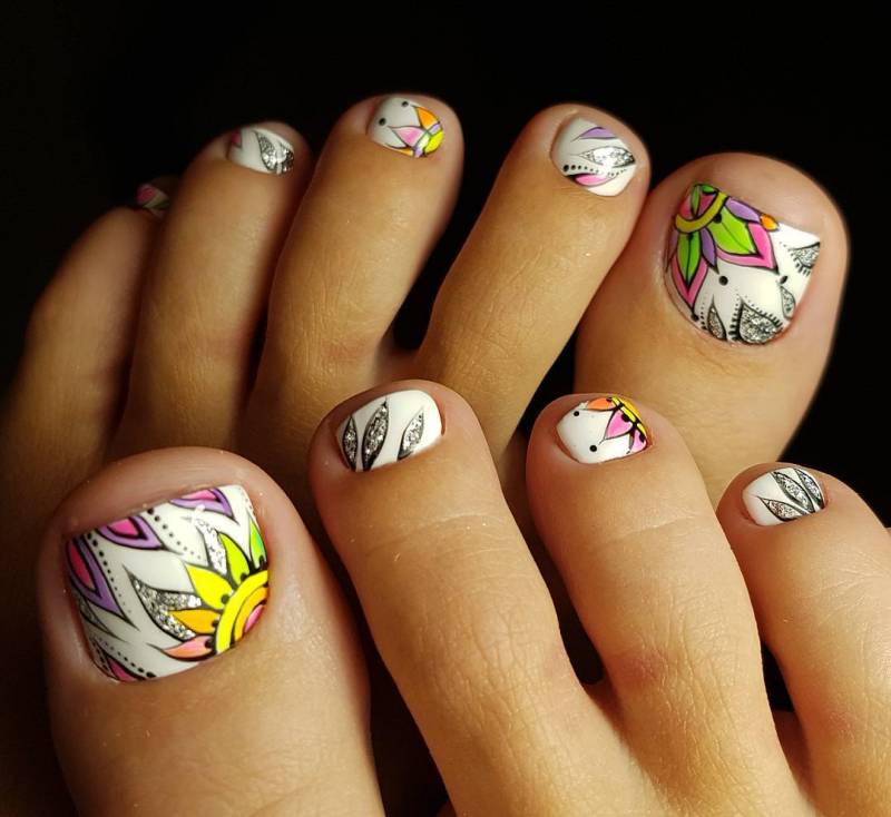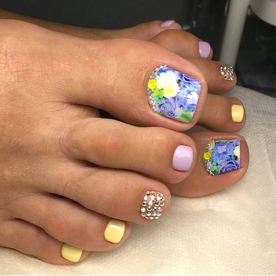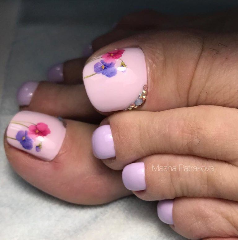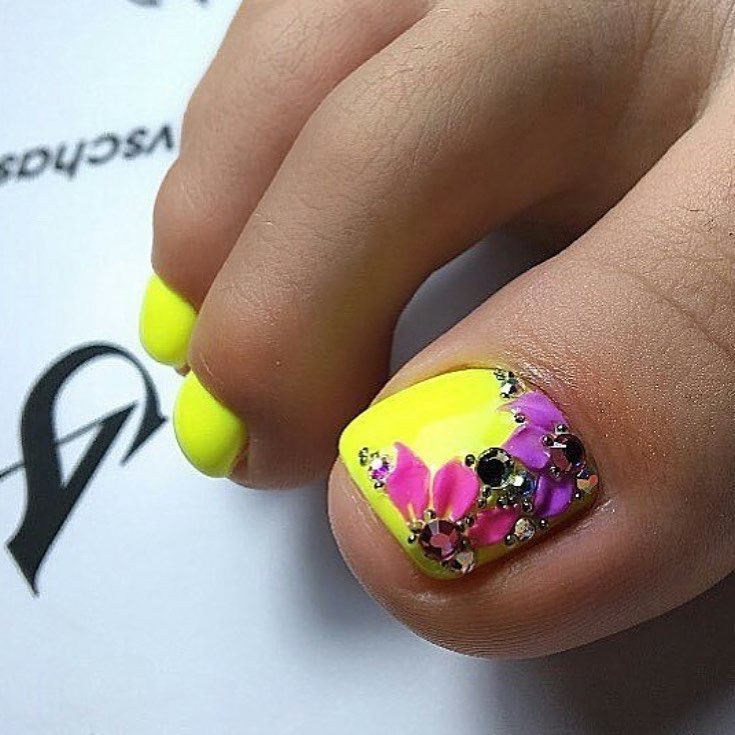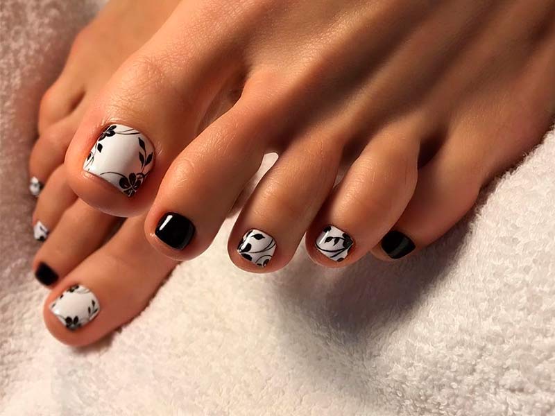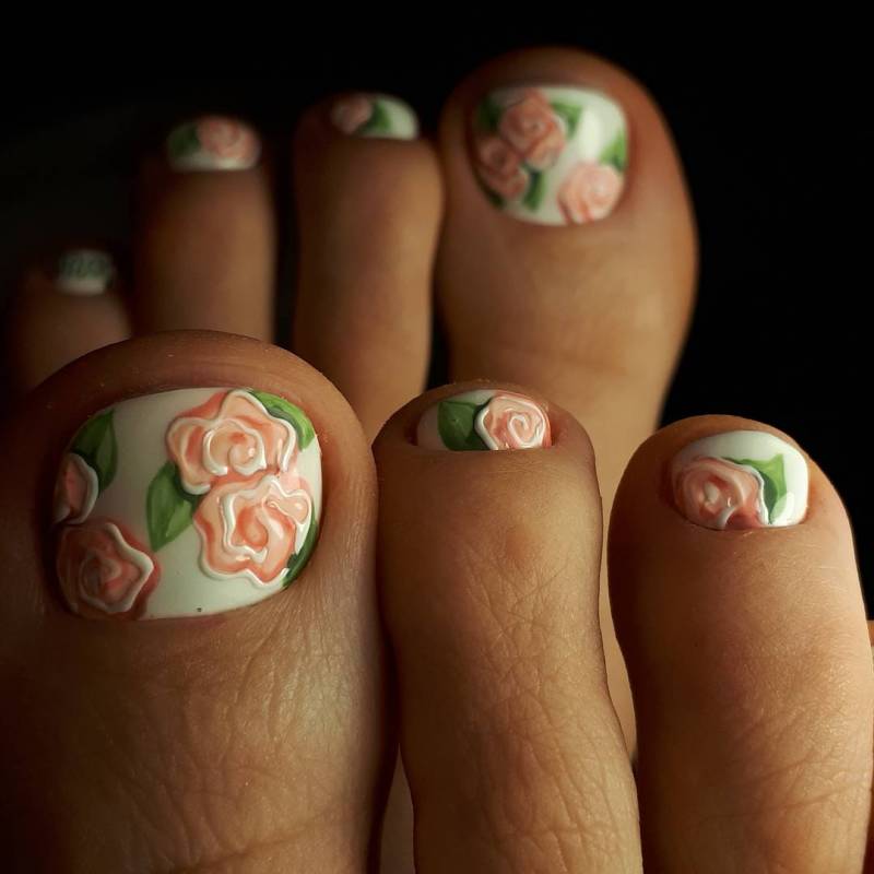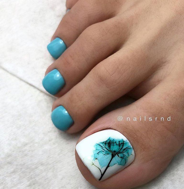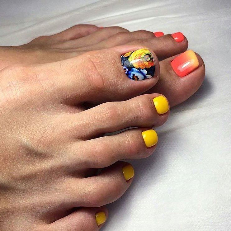 L'image de fleurs et de plantes diverses est une option gagnant-gagnant pour la création d'un pédicure d'été à la mode et élégant. Les dessins floraux sont très beaux et élégants, ils contribueront toujours à créer un design de pédicure estival «vivant» et à revitaliser l’ensemble de l’image créée. Une variété d'images de fleurs, feuilles, brindilles de palmiers sera belle et originale dans la conception estivale de la pédicure.
