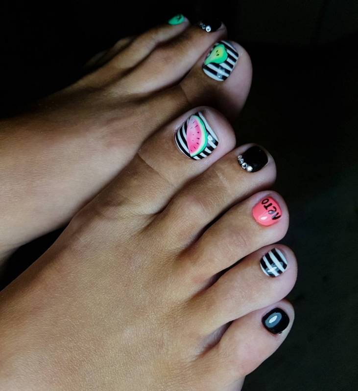 Les nouvelles tendances de la pédicure estivale vous étonnent par leur design coloré, excitant et vibrant. Le point principal de toute pédicure élégante et moderne sera les impressions, les motifs et les dessins. Selon l’image créée, il est judicieux de choisir le modèle de pédicure approprié: il peut s’agir d’une dispersion de paillettes et de strass, de nuances lumineuses de vernis ou de dessins envoûtants de divers sujets. Une pédicure en couleurs nude mat aura également l’air très séduisante et mignonne. Une veste délicate ou ombre est parfaite pour les pédicures estivales quotidiennes. Original et pertinent cet été sera une pédicure avec des motifs prédateurs, l’image d’hirondelles délicates, un cœur mignon, ou une sculpture magnifique et volumineuse sur les ongles. Il est préférable d'utiliser divers suppléments dans une pédicure estivale à la mode sur la vignette.