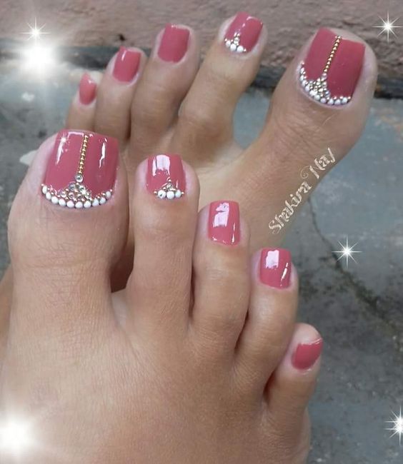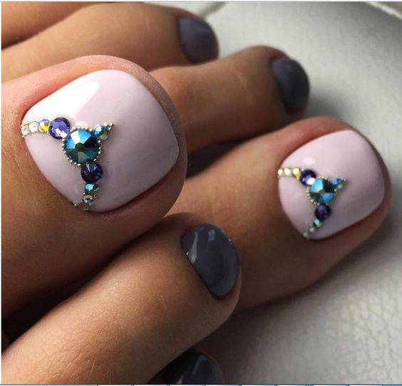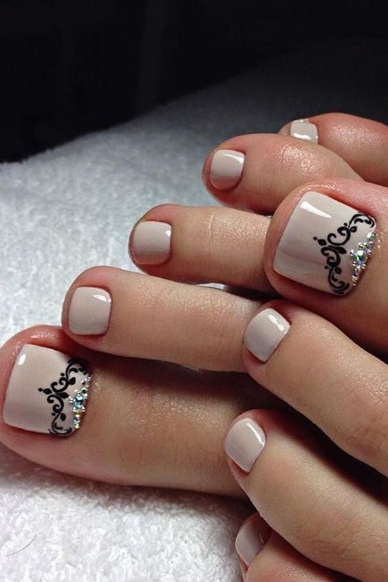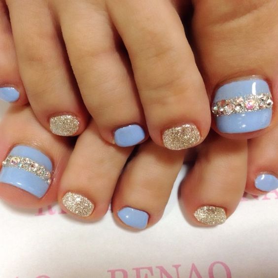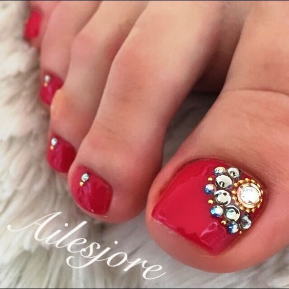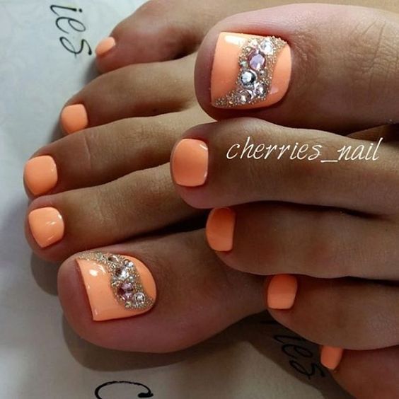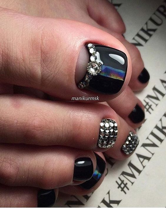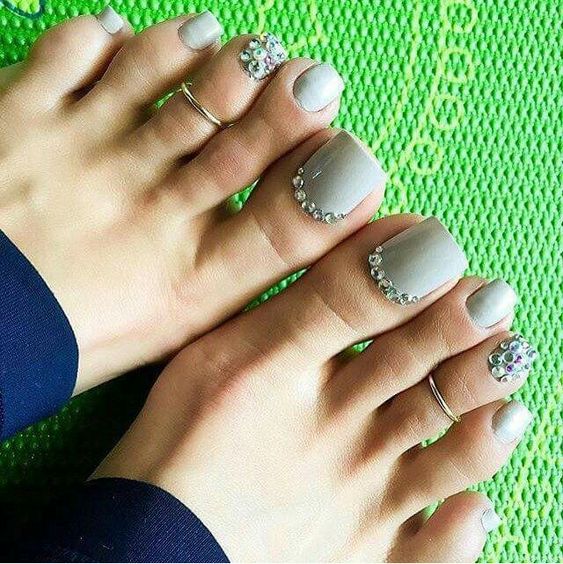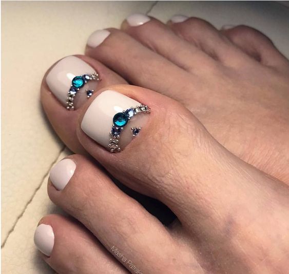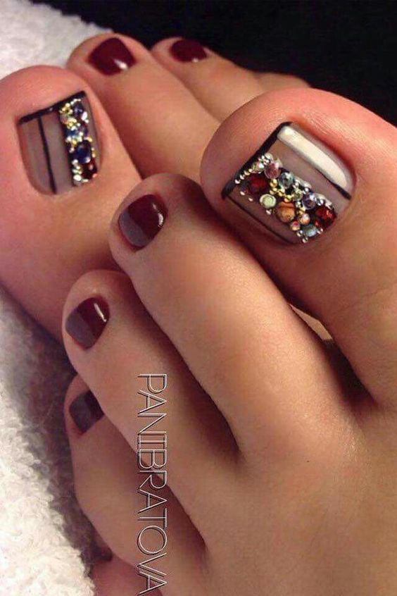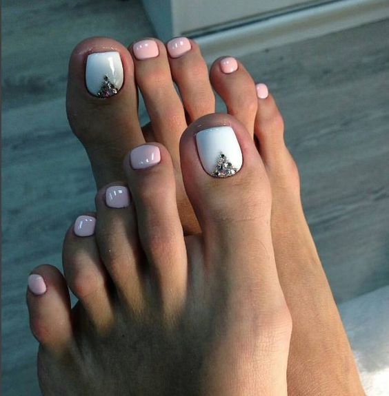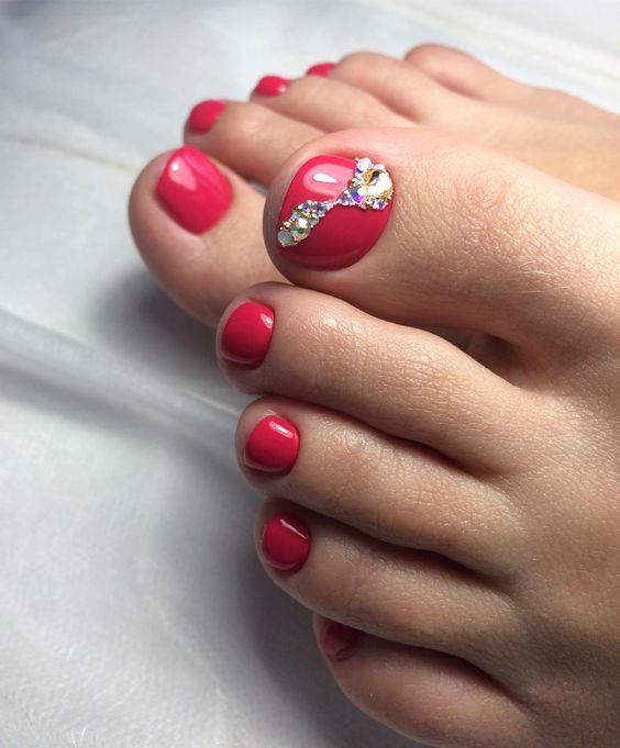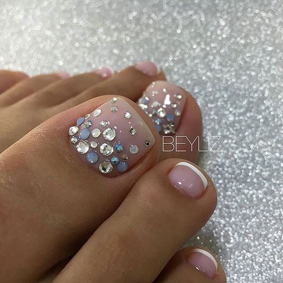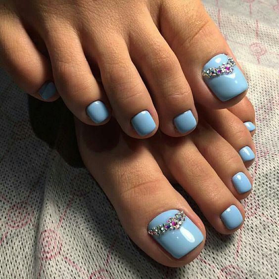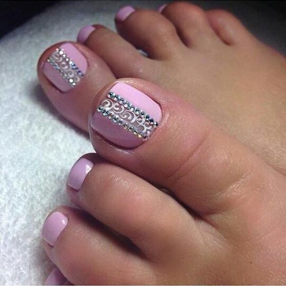 Les strass jouent un rôle important dans la pédicure. De plus, leur emplacement n’est absolument pas fondamental. Les strass sont beaux à la fois sur un ongle et sur tous. En plus de ces éléments de décoration, diverses paillettes peuvent également être utilisées comme décoration. Après avoir complété une pédicure monochromatique par au moins un caillou, vous transférez automatiquement le dessin des ongles de la catégorie ennuyeux à la catégorie attrayant.