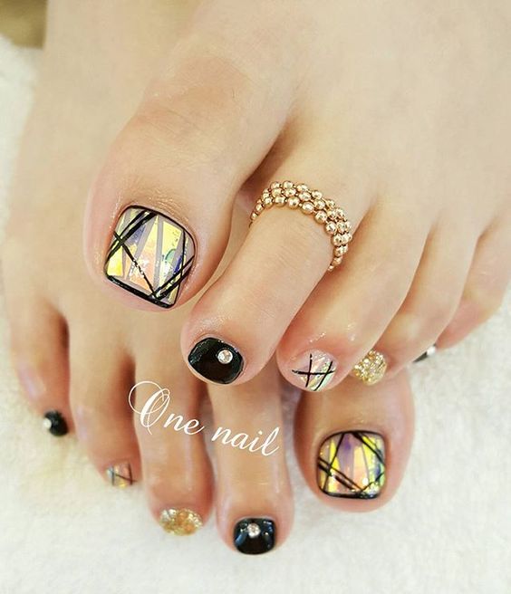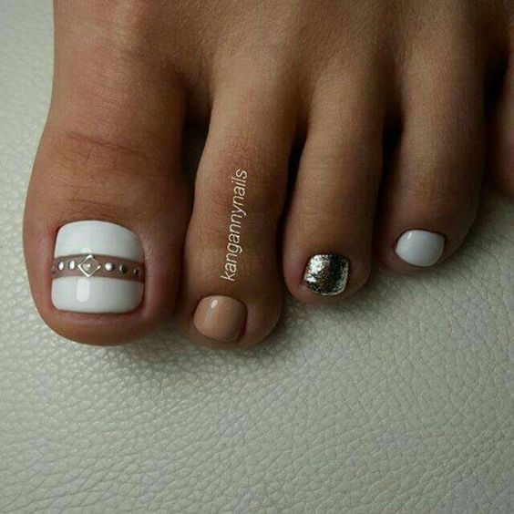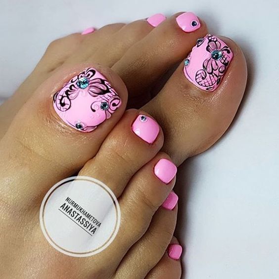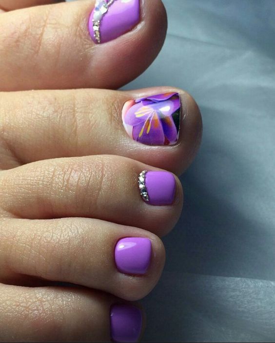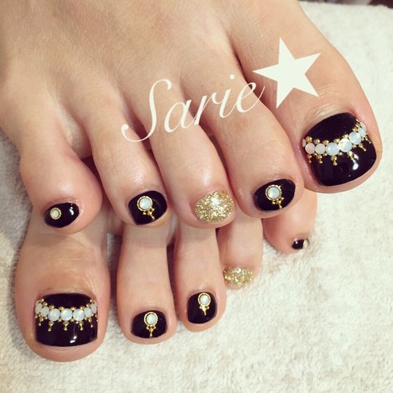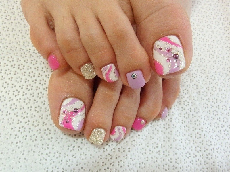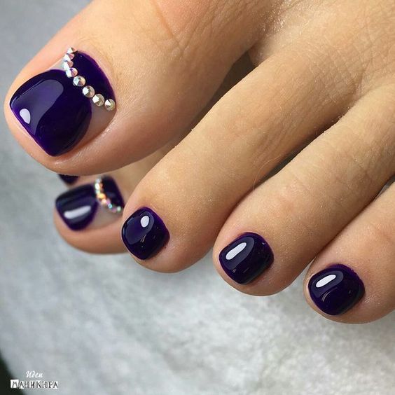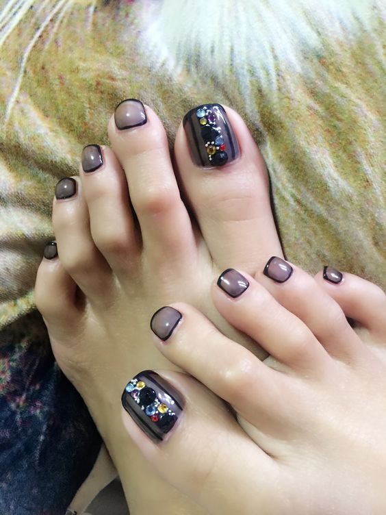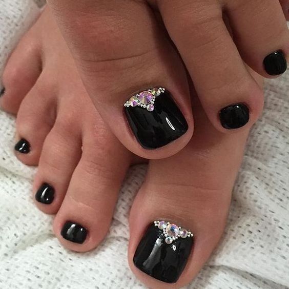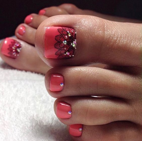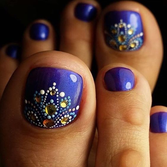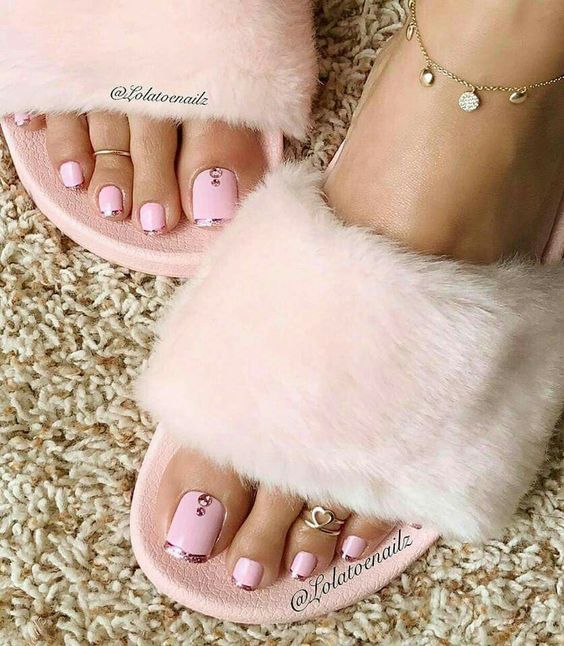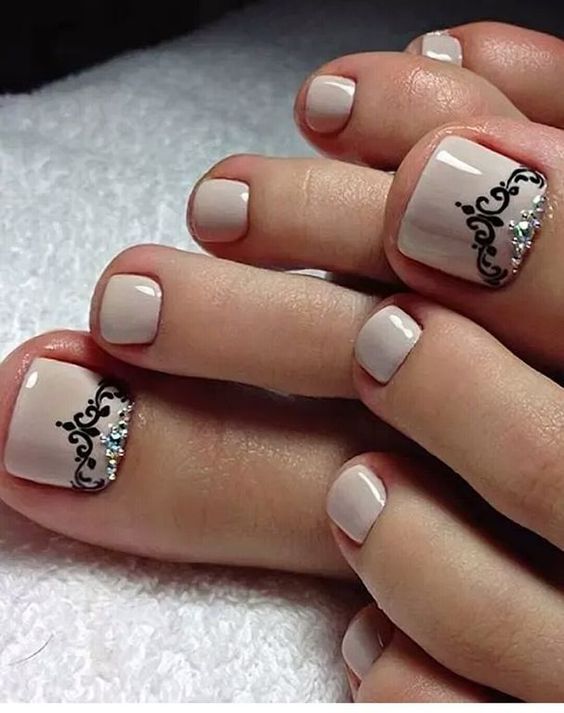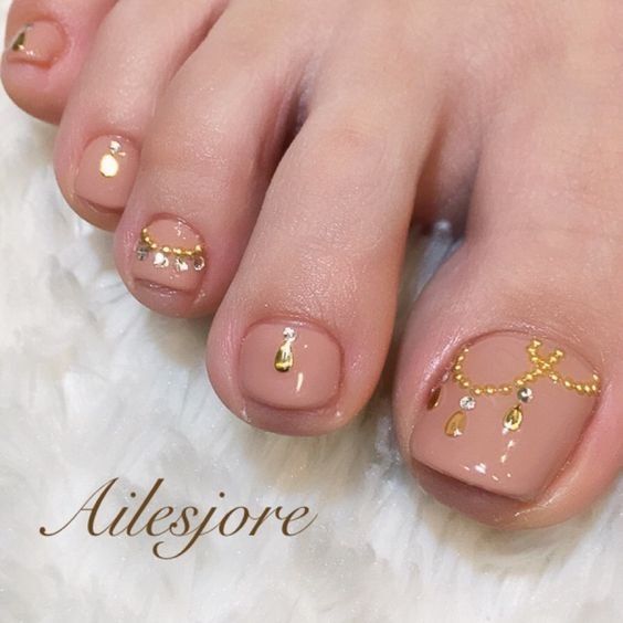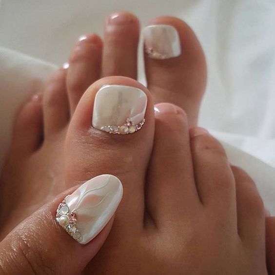 Les strass jouent un rôle important dans la pédicure. De plus, leur emplacement n’est absolument pas fondamental. Les strass sont beaux à la fois sur un ongle et sur tous. En plus de ces éléments de décoration, diverses paillettes peuvent également être utilisées comme décoration. Après avoir complété une pédicure monochromatique par au moins un caillou, vous transférez automatiquement le dessin des ongles de la catégorie ennuyeux à la catégorie attrayant.