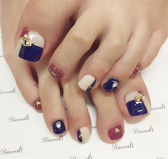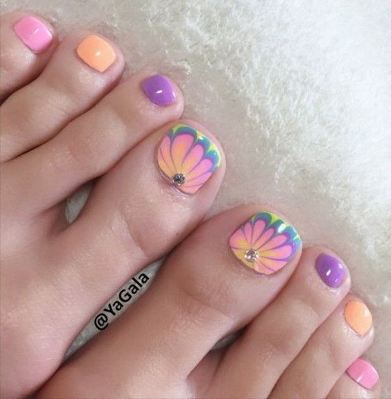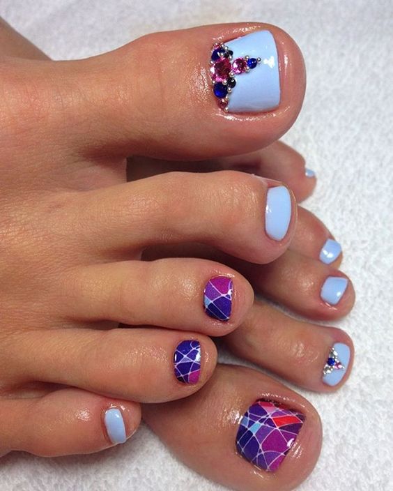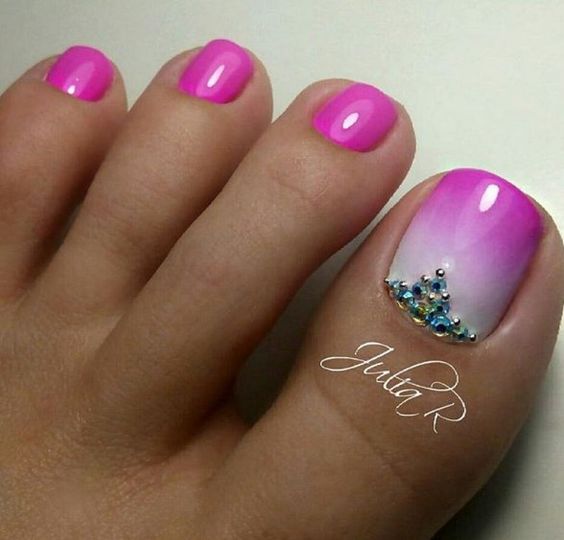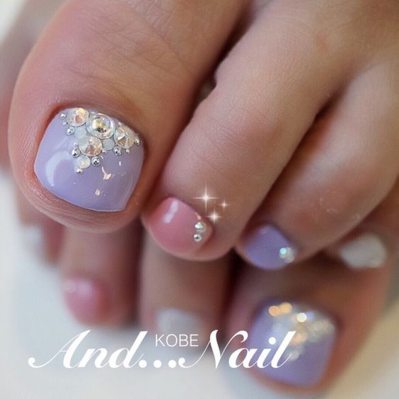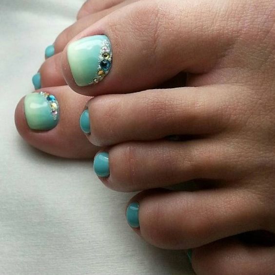 Pédicure de couleur tendance avec des strass.