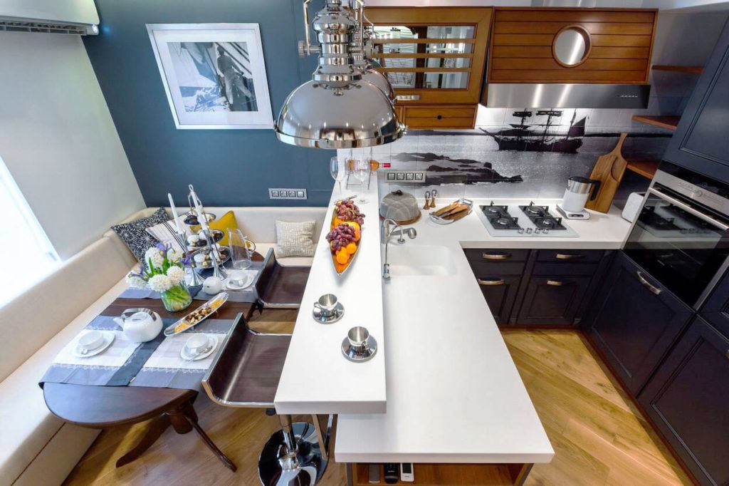 Lors de la combinaison d'un îlot de cuisine avec l'une des surfaces de travail, un système de planification péninsulaire est obtenu. Une telle saillie peut être un zonage de la salle à manger ou de la zone de travail.