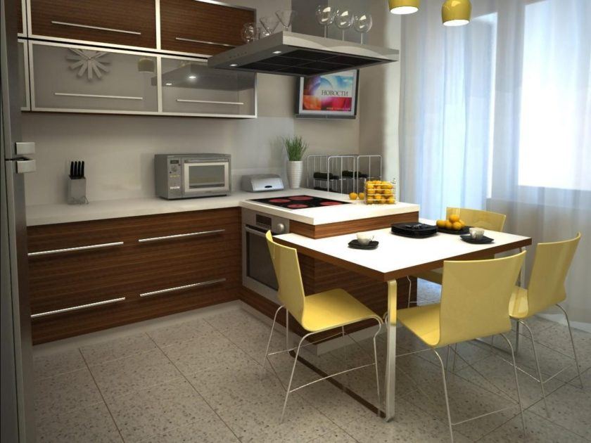 Dans les locaux de petite superficie, il est difficile de parler de l’emplacement de la salle à manger, mais il sera possible d’intégrer avec succès des appareils ménagers dans un petit espace. La sévérité des formes et des lignes, un décor minimal, des éléments de miroir et de verre, des couleurs de décoration claires - des techniques qui agrandissent visuellement tout espace.