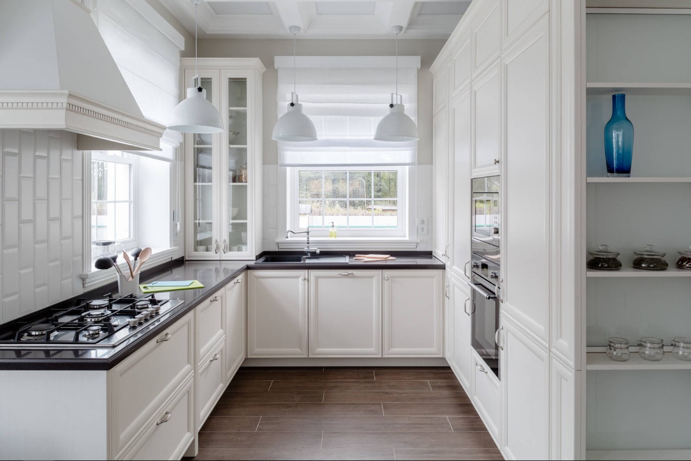Ce type de planification spacieux et pratique convient aux cuisines de grande et moyenne taille. Les éléments du triangle dans ce cas vont très bien. La disposition en forme de U présente plusieurs avantages: la possibilité d'installer un nombre important de systèmes de stockage, d'appareils électroménagers, d'appareils ménagers et de surfaces de travail est située le long de trois murs. Ce système est très difficile à appliquer pour les petites pièces.