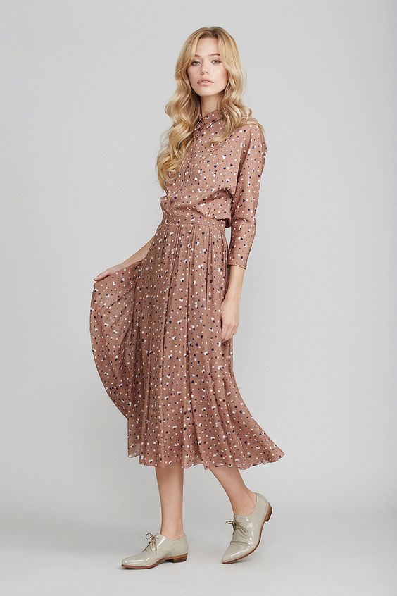 La version de bureau de la robe chemise ne devrait pas être trop courte et provocante, mais un style long ne sera pas non plus approprié. Par conséquent, il est préférable de privilégier la longueur universelle du midi. La coloration doit également être restreinte et non provocante, dans une interprétation feutrée et douce. Il est préférable de compléter la robe avec une fine ceinture élégante et des escarpins.