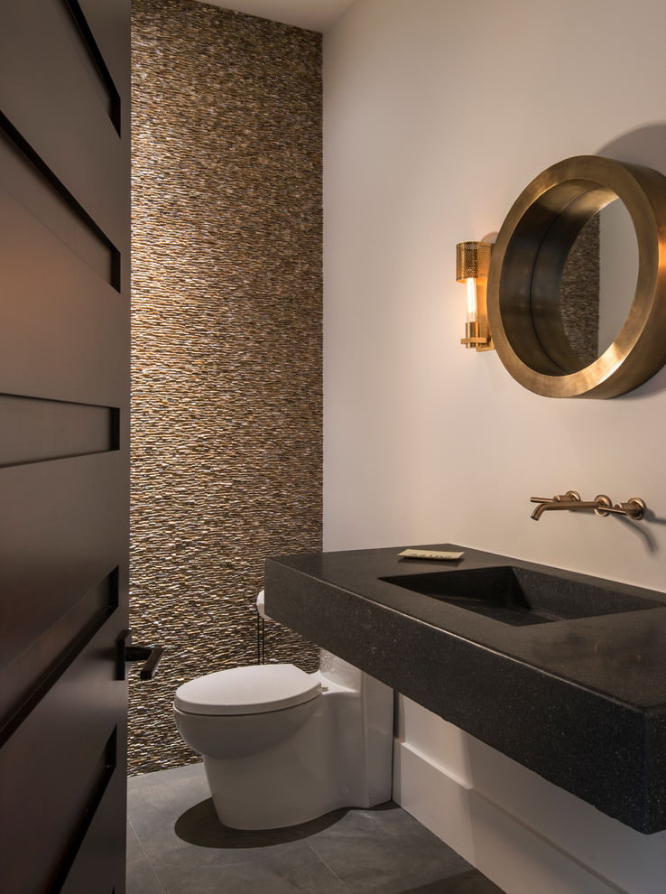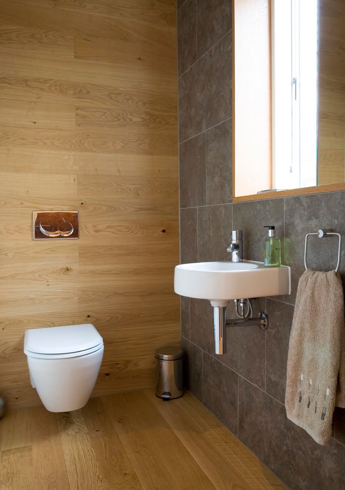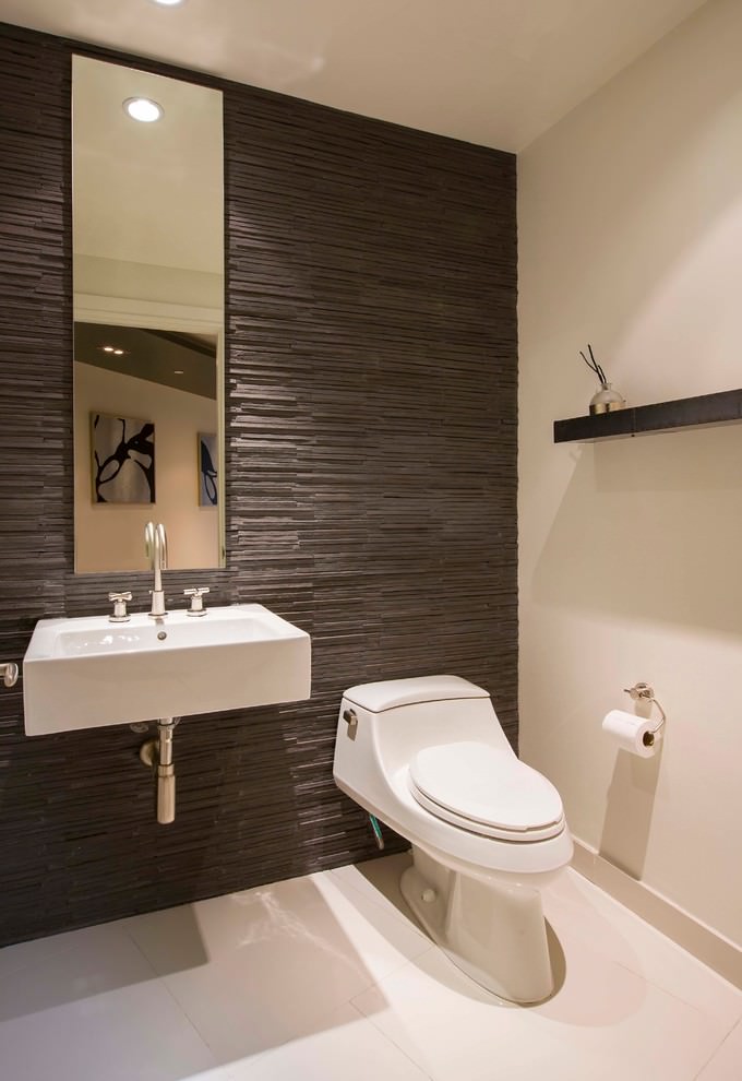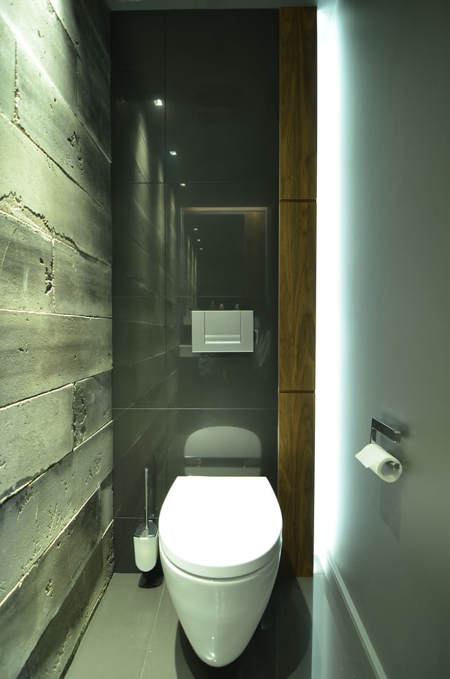 Les carreaux de céramique résistants, mieux connus sous le nom de carreaux de porcelaine, sont couramment utilisés pour les revêtements de sol. Mais récemment, on le trouve de plus en plus souvent sur les murs de petites toilettes. Cette version du revêtement est considérée comme la plus pratique. Le grès cérame est généralement gros, sa pose prend donc beaucoup moins de temps. Et la variété de couleurs sur le marché vous permet d'utiliser cette option de finition pour équiper la salle de bain de n'importe quel style.