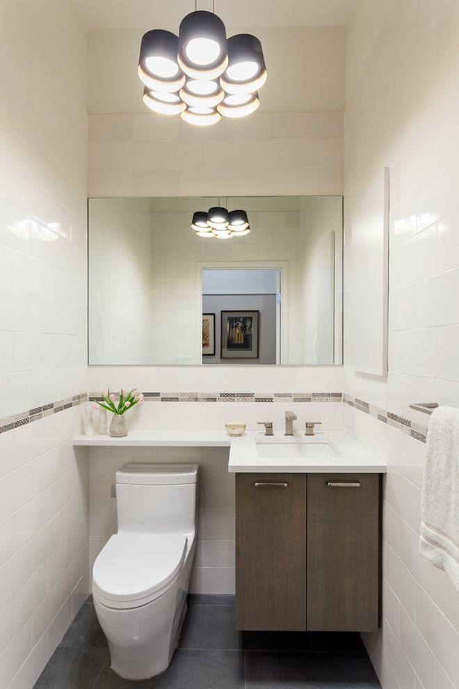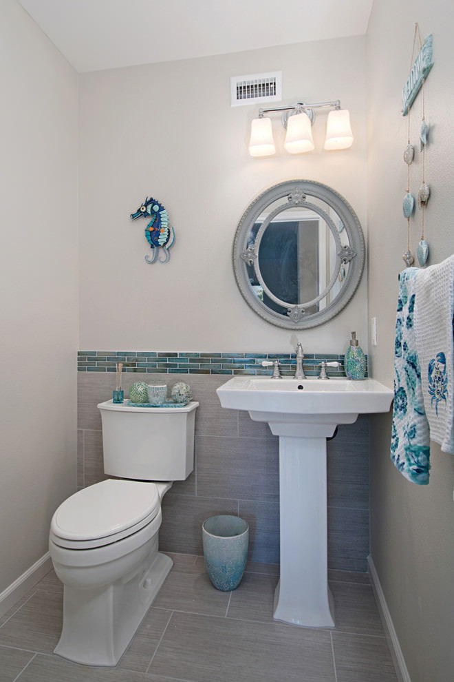 Très souvent, les concepteurs qui conçoivent de petites salles de bains divisent le mur avec une bordure horizontale. La teinte du haut du mur devrait être beaucoup plus claire que celle du bas. Si vous envisagez d'utiliser une bordure décorative, il est préférable de la placer au niveau des yeux.