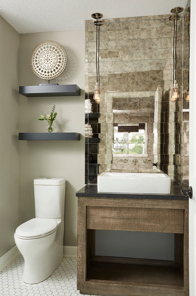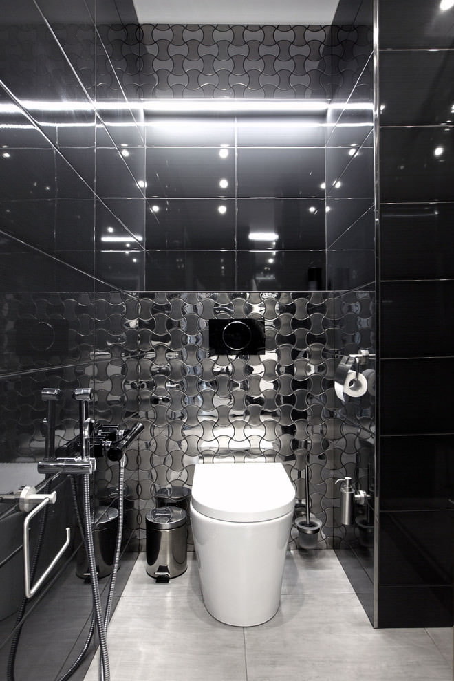 Les carreaux sombres sont spectaculaires avec une plomberie blanche comme neige, et les tons pastel rendront la pièce sophistiquée et sophistiquée. Le revêtement de miroir décorera non seulement une petite salle de bain, mais le rendra visuellement plus large. Cependant, en choisissant ce matériau, vous devez être prêt pour un nettoyage constant.