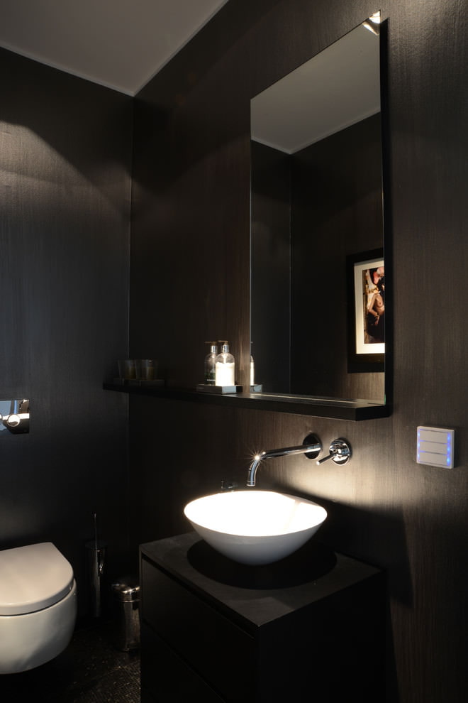 Si les carreaux sombres sont choisis pour la finition d'une petite salle de bain, vous devez vous occuper d'un éclairage de haute qualité. Sinon, être ici ne sera pas confortable.