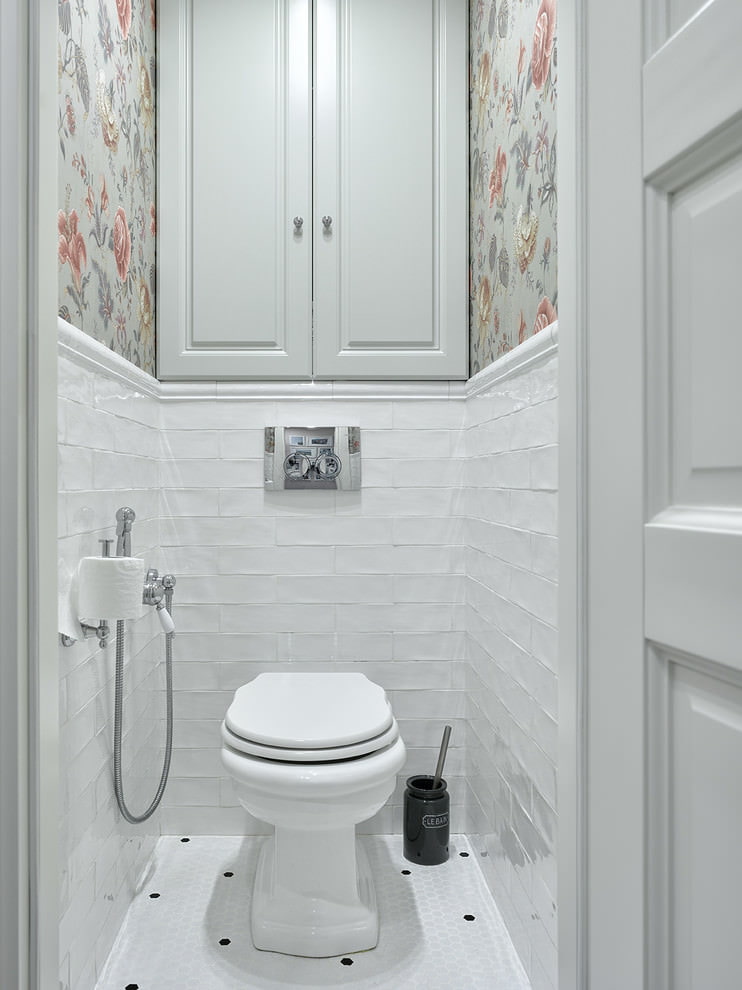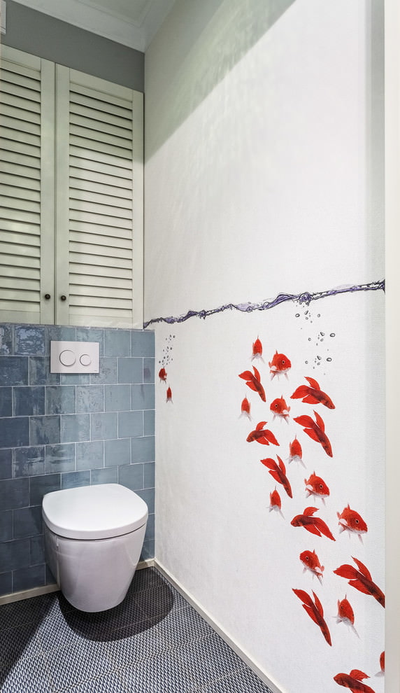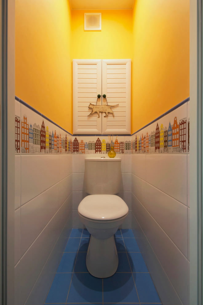 Une bonne option pour concevoir une toilette peut être l’utilisation de plusieurs types de carreaux sur une surface qui diffèrent par la teinte ou la texture. Une combinaison de carreaux «métro» et de carreaux texturés multicolores donnera un aspect brillant dans un petit espace. La mosaïque et les carreaux de céramique se complètent parfaitement.
