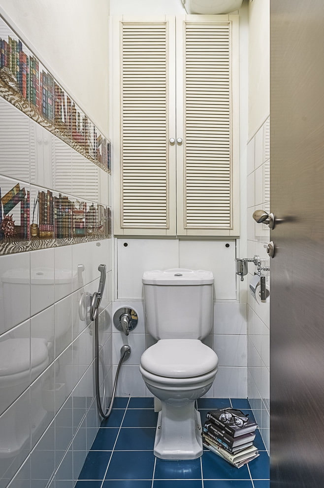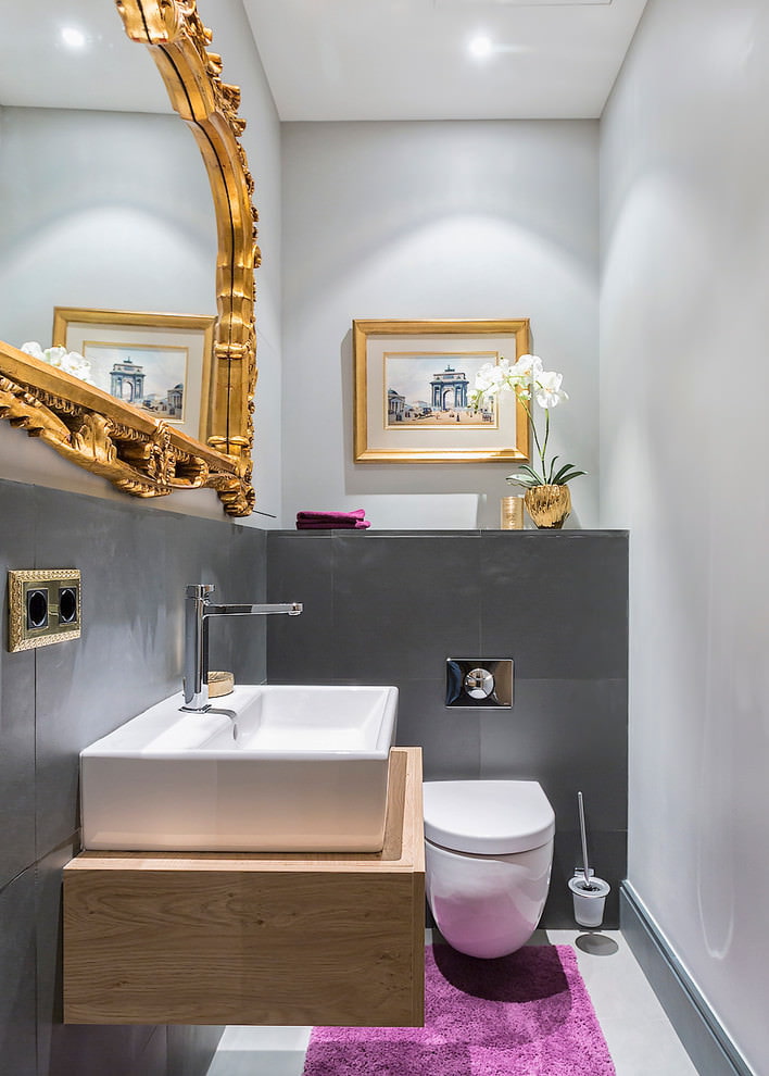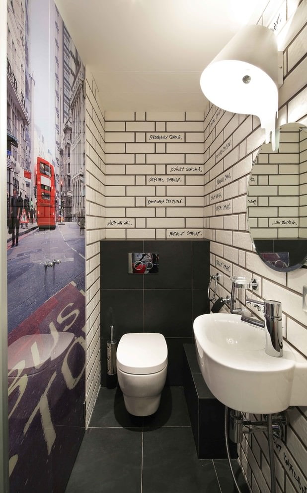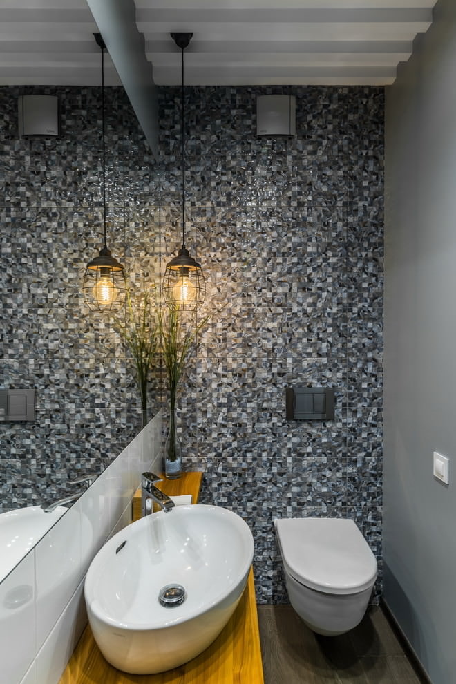 Une bonne option pour concevoir une toilette peut être l’utilisation de plusieurs types de carreaux sur une surface qui diffèrent par la teinte ou la texture. Une combinaison de carreaux «métro» et de carreaux texturés multicolores donnera un aspect brillant dans un petit espace. La mosaïque et les carreaux de céramique se complètent parfaitement.