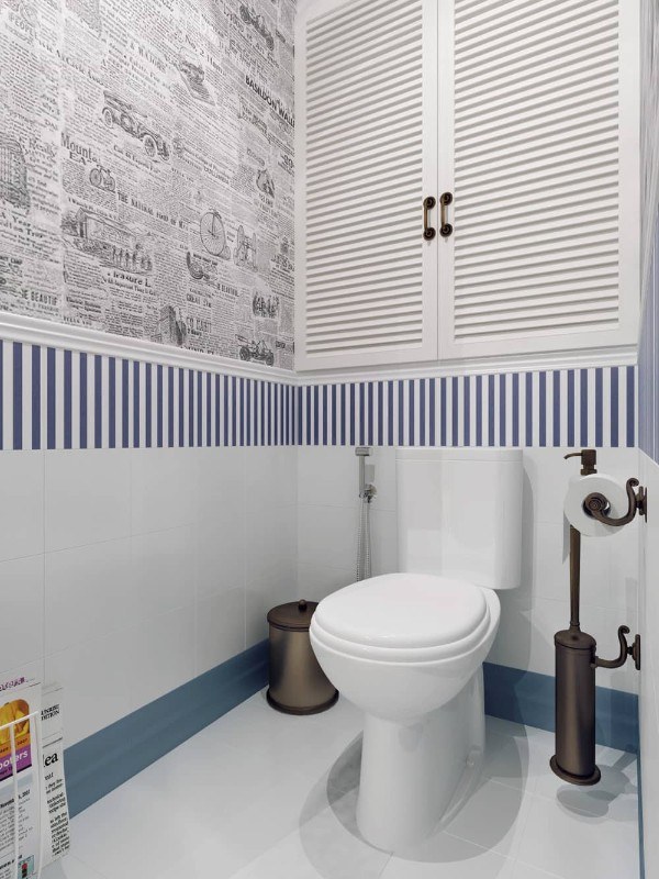 Très souvent, les concepteurs qui conçoivent de petites salles de bains divisent le mur avec une bordure horizontale. La teinte du haut du mur devrait être beaucoup plus claire que celle du bas. Si vous envisagez d'utiliser une bordure décorative, il est préférable de la placer au niveau des yeux.