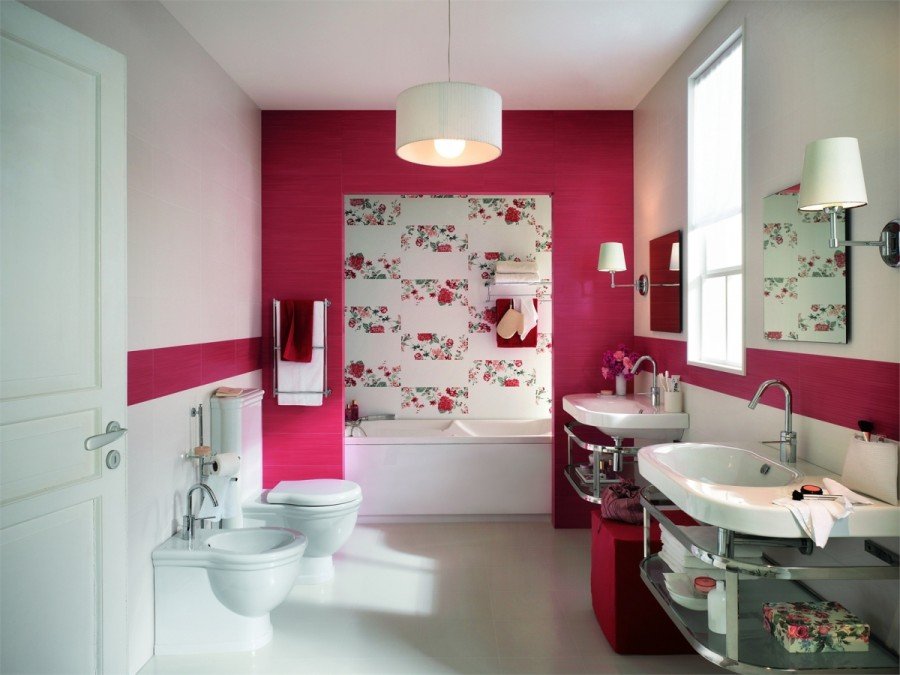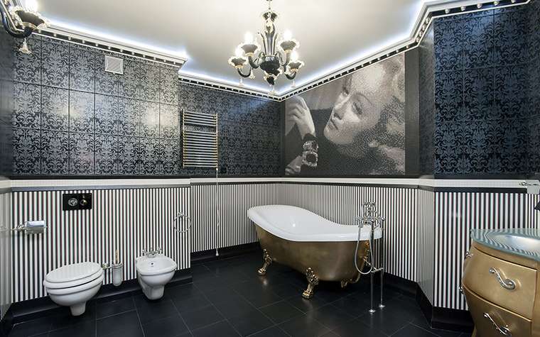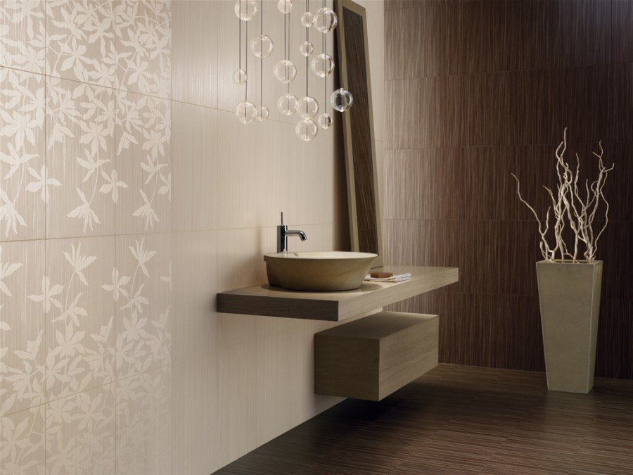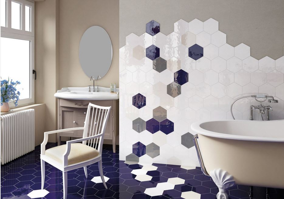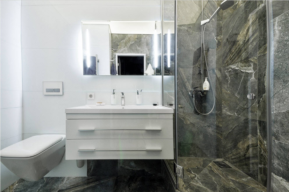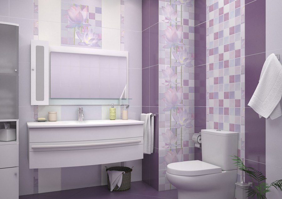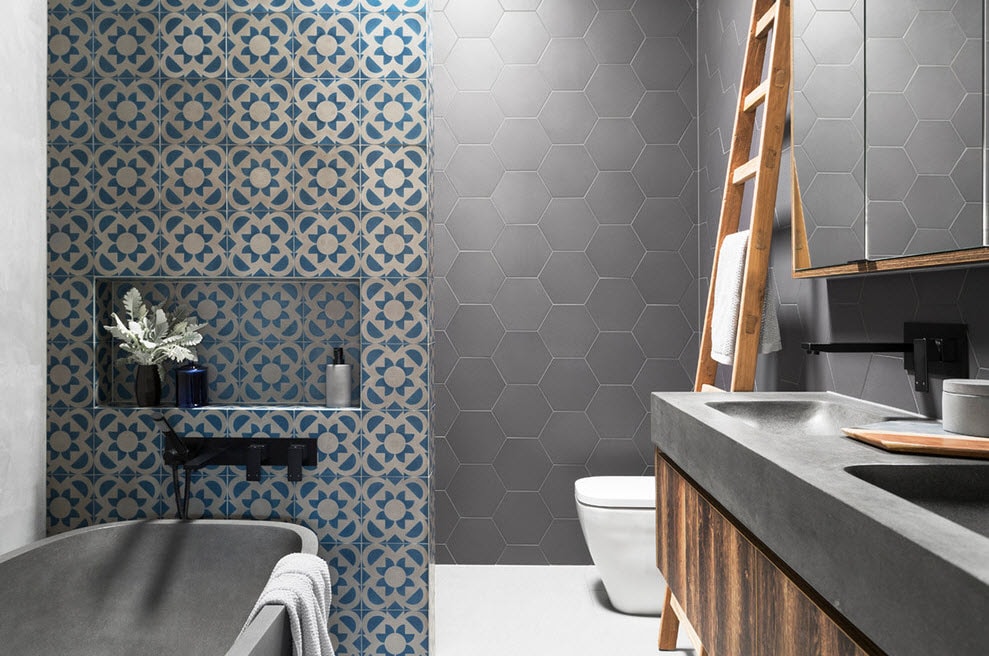 Un design intéressant et riche dans une salle de bain moderne est obtenu grâce à la combinaison de plusieurs types de ce carrelage.