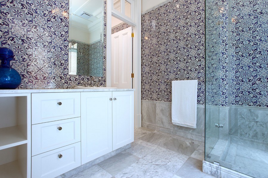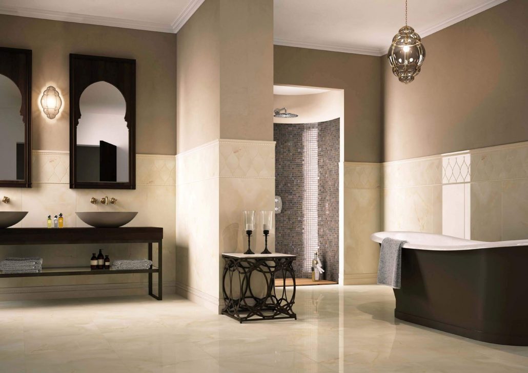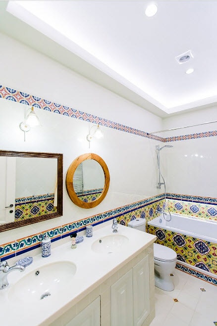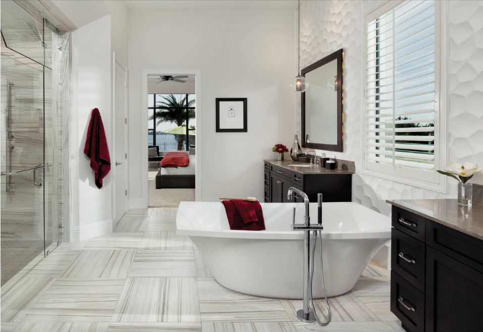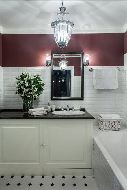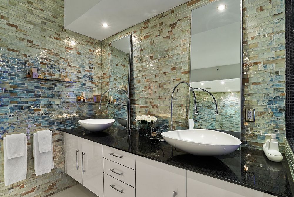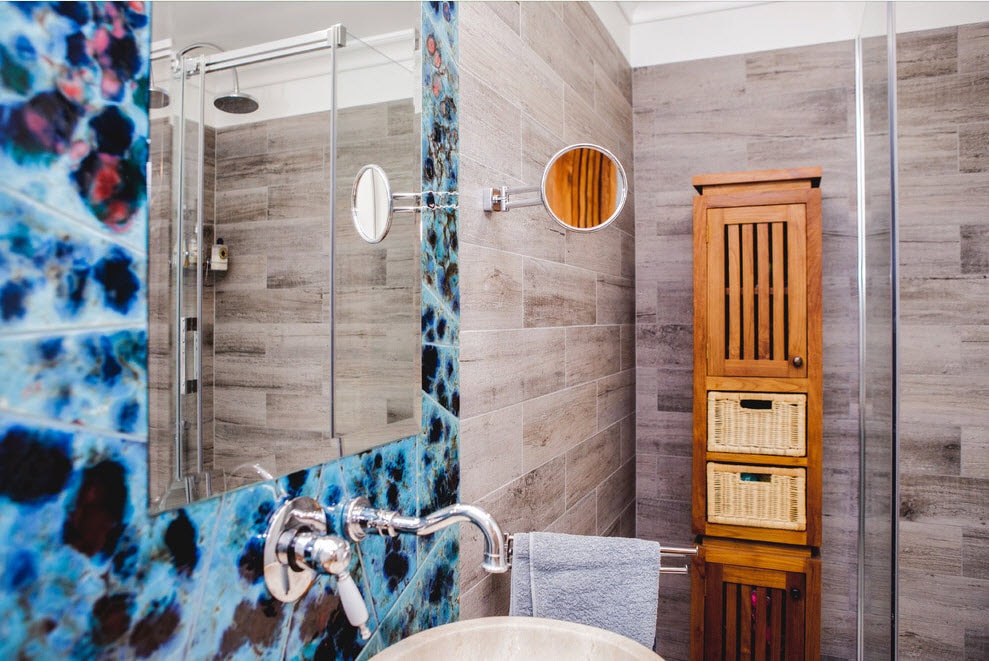 Un design intéressant et riche dans une salle de bain moderne est obtenu grâce à la combinaison de plusieurs types de ce carrelage.