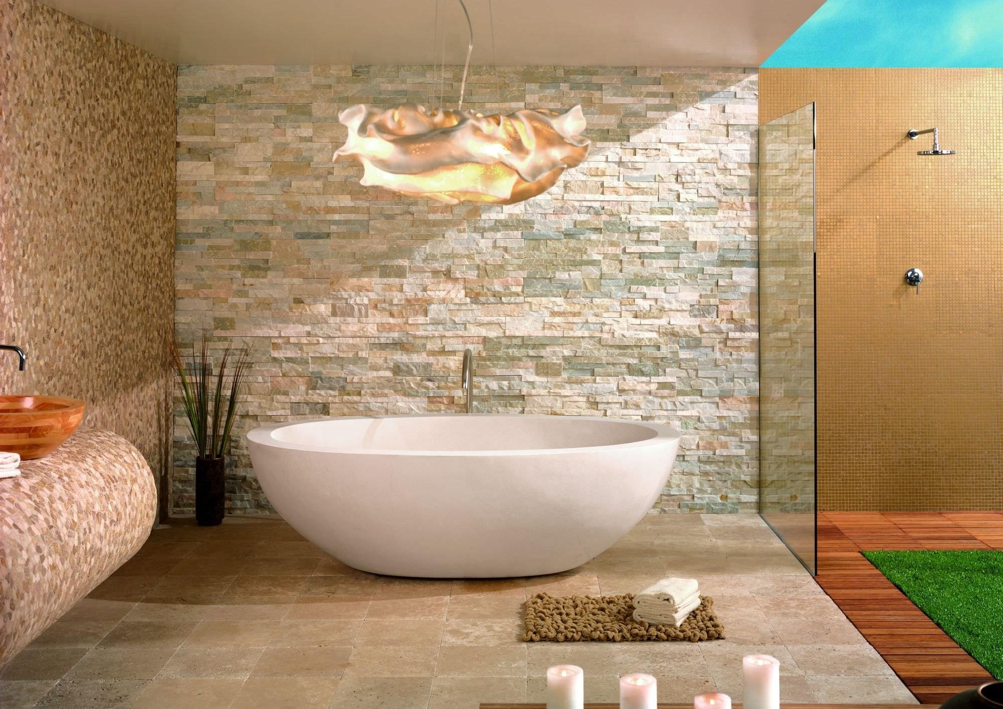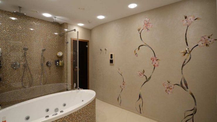 Dans la salle de bain, les murs sont recouverts de papier peint, de stuc, de bois, de pierre artificielle ou naturelle. Mais la dalle est l'option la plus pratique pour le revêtement. Il peut être sélectionné pour n’importe quelle pièce, grâce à son prix relativement avantageux, à sa large gamme de couleurs et à son grand choix de motifs.