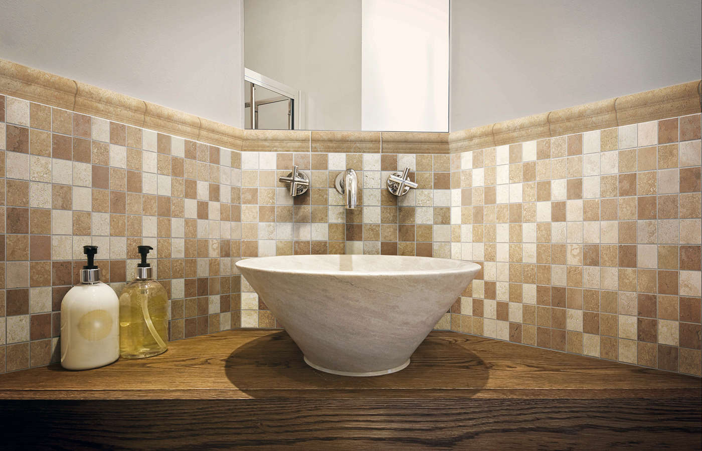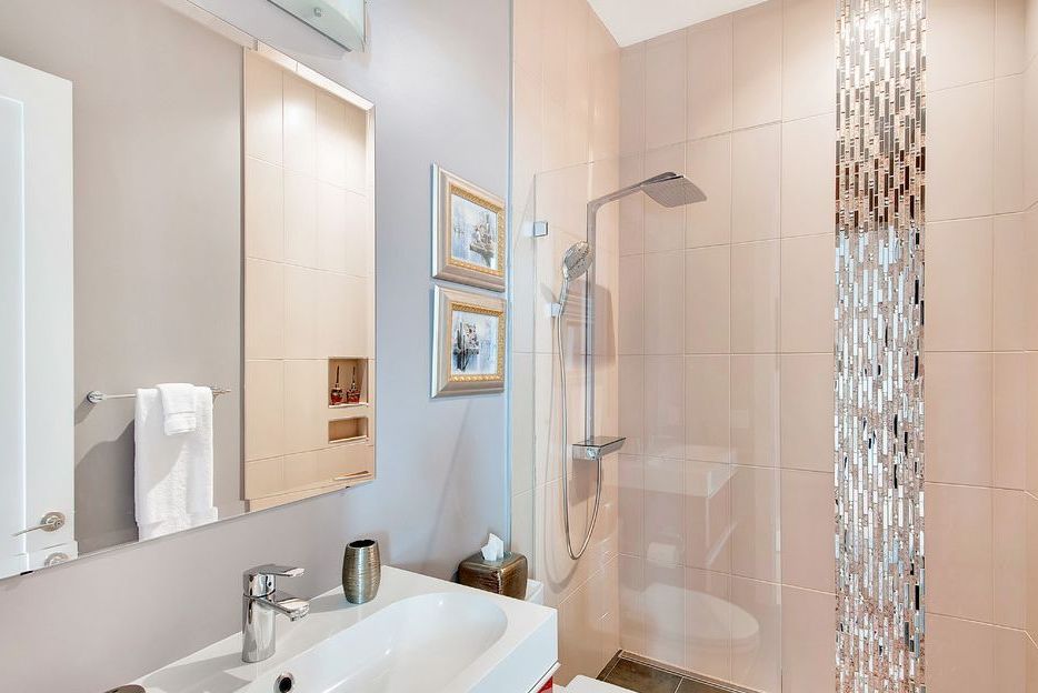 Ne pensez pas que le design de la salle de bain sera ennuyeux si vous utilisez des couleurs douces et atténuées. On obtient un design coûteux en combinant des carreaux de taille moyenne sur les murs et de petits carreaux au sol.