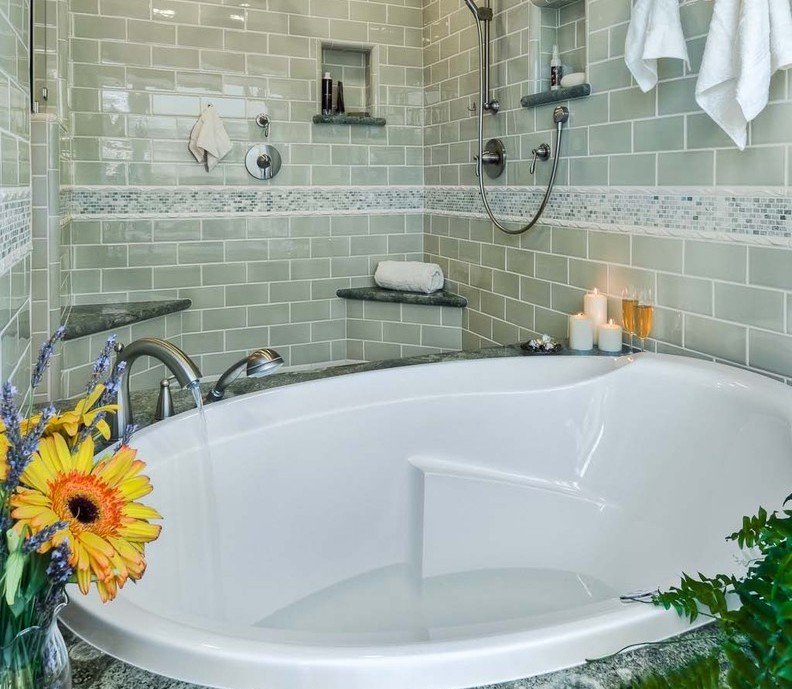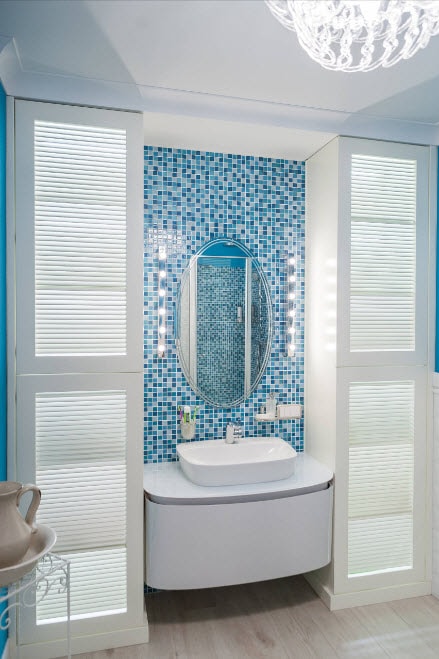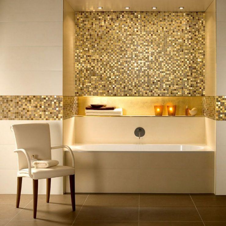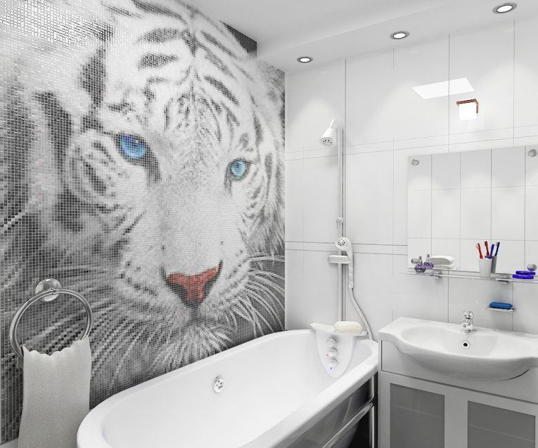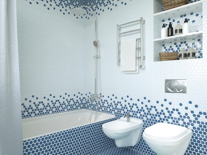 Il est préférable de combiner la mosaïque dans la salle de bain avec une plus grande tuile. Cela vous permet de zoner l'espace, de l'étendre visuellement, de créer des transitions douces et des accents lumineux.